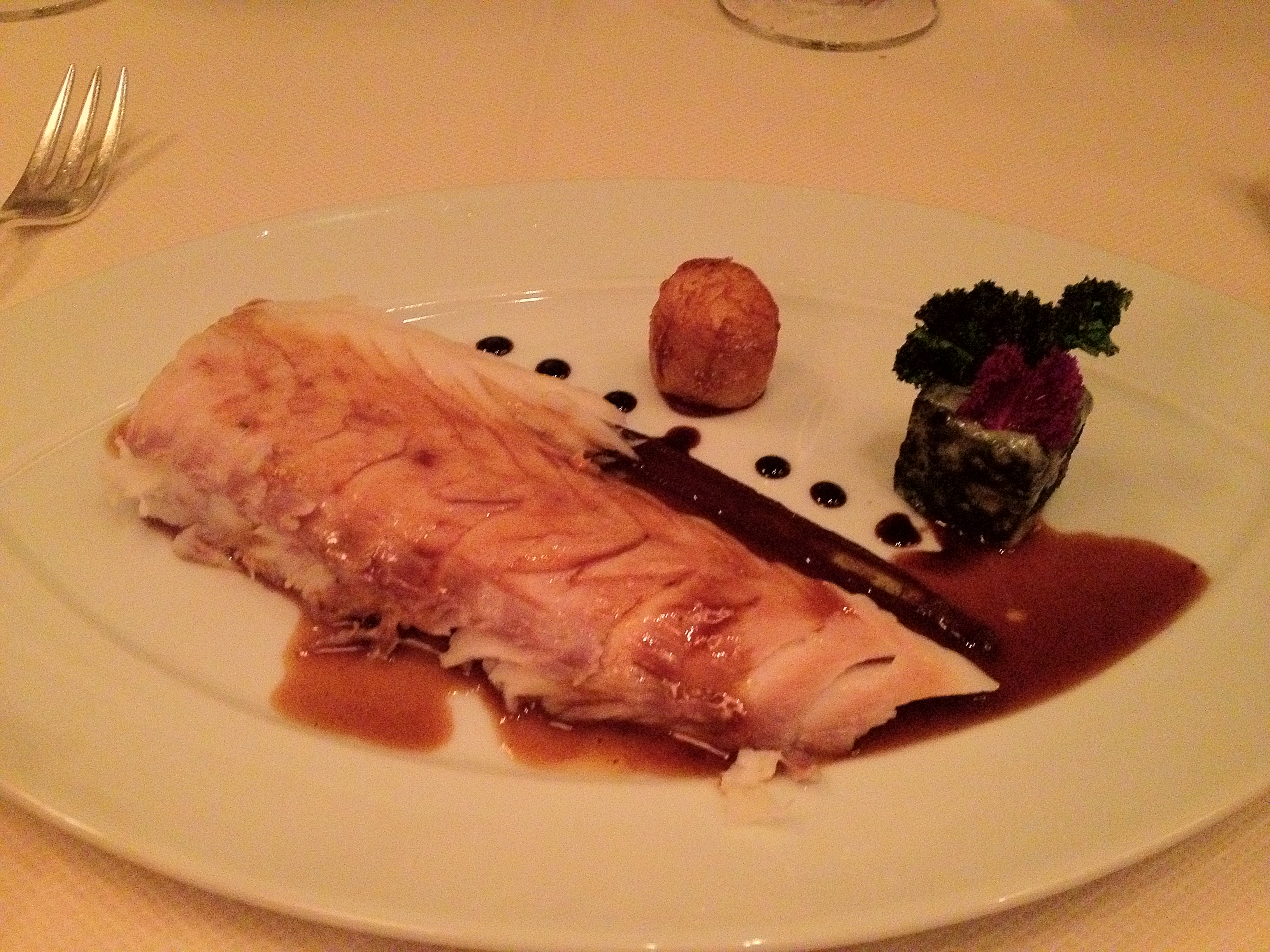 Tad: Haha, I’ve also been to Paris (more than once), but that didn’t make me enjoy this terrine any more. Okay, in all honesty, I could recognize the craft and the skill involved in making the terrine and cutting it into the oh so perfect blocks threaded with black truffle. But to me, given the luxury ingredients used, the payoff wasn’t that great. It could have been a head cheese terrine and I would not have noticed too big a difference. Well, maybe except for the concentrated truffle flavor. The standout for me were the vegetables in this dish. The artichoke heart had a tangy, briny flavor that accentuated the richness of the black truffle sauce. And the palm heart was sitting on some sort of puree that was just magnificent.