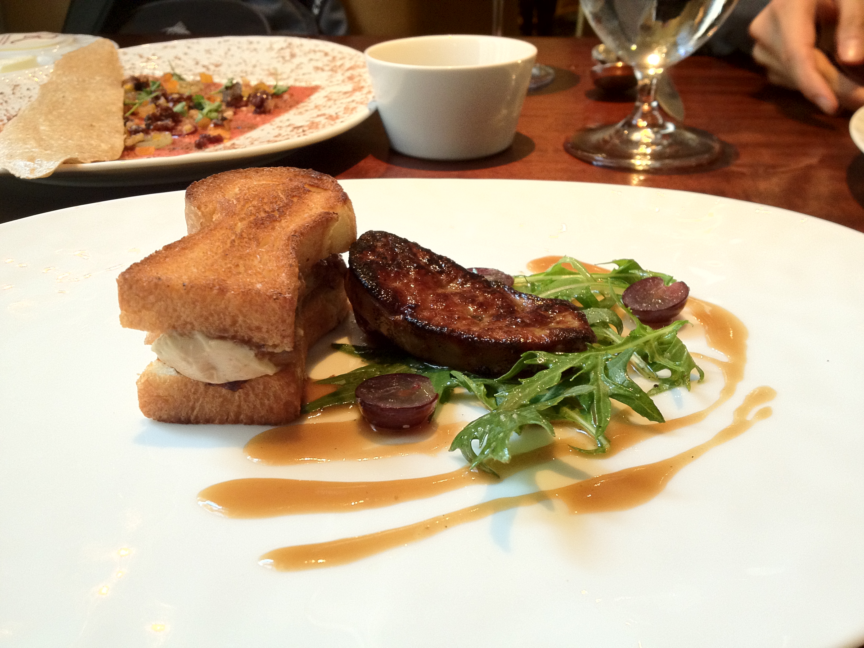 Monte: It’s a fun dish and tasted really good. I’m not sure if the rich liver was enhanced any by the pb&j sandwich, but it’s kind of like that scene in Friends where Rachel screws up the English trifle but Joey just responds “What’s not to like?”. Pecan butter is good, fig jam is good, and foie is goooood. My only quibble is that I wish the foie itself was served warmer, so that it would taste juicier on the inside.