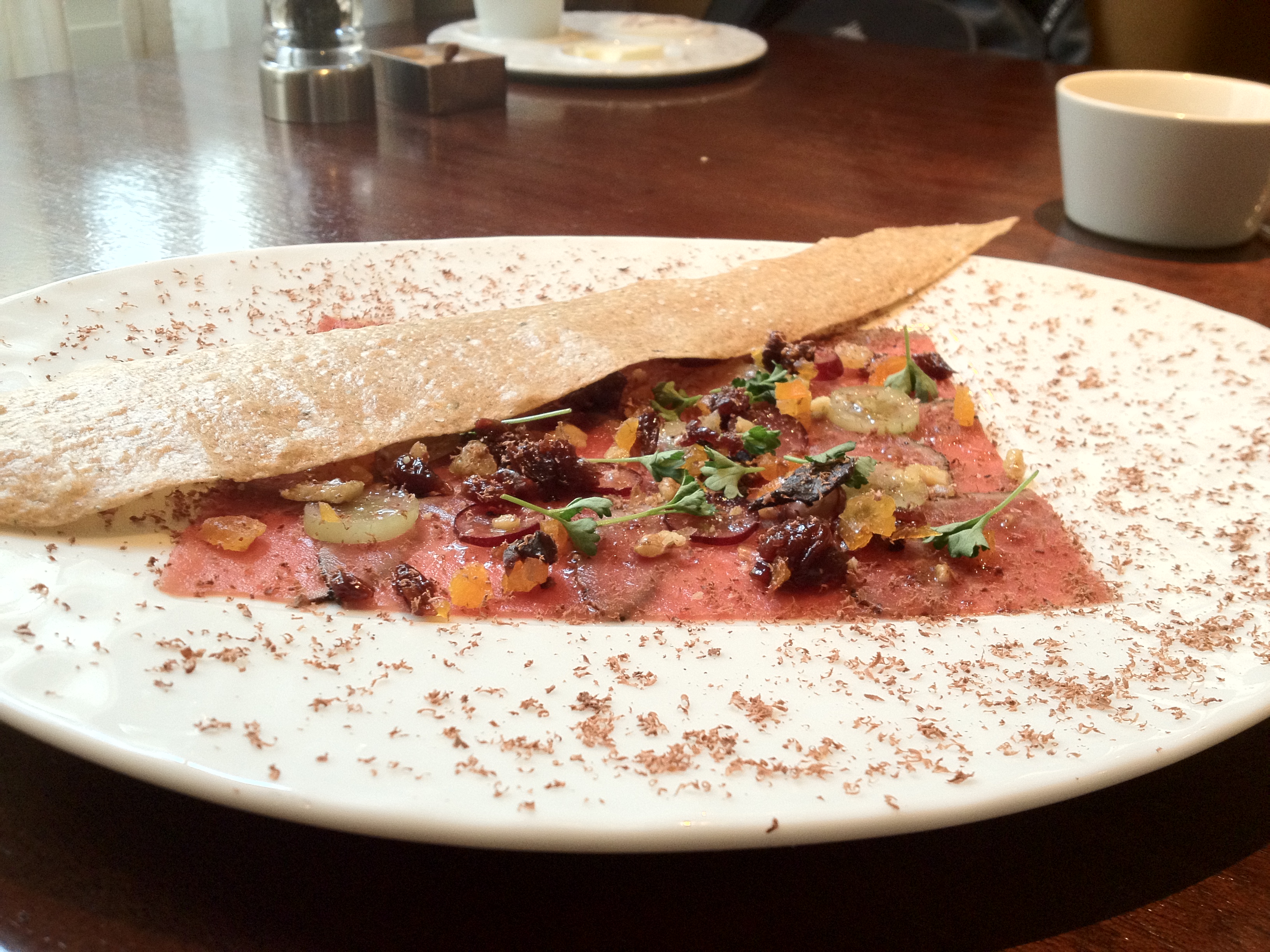 Monte: This dish made me think really really hard. The flavors of each ingredient were very strong and distinct, and yet I’m not sure if it melded all together. The venison carpaccio tasted like a slightly gamey beef carpaccio, but there were competing flavors of nuttiness from the walnuts, sweetness and bitterness from the cacao, and sweetness and fruitiness from the dried fruit, with the resulting amalgam confusing my taste buds. I certainly didn’t dislike it, but I’m not sure if I liked it either.