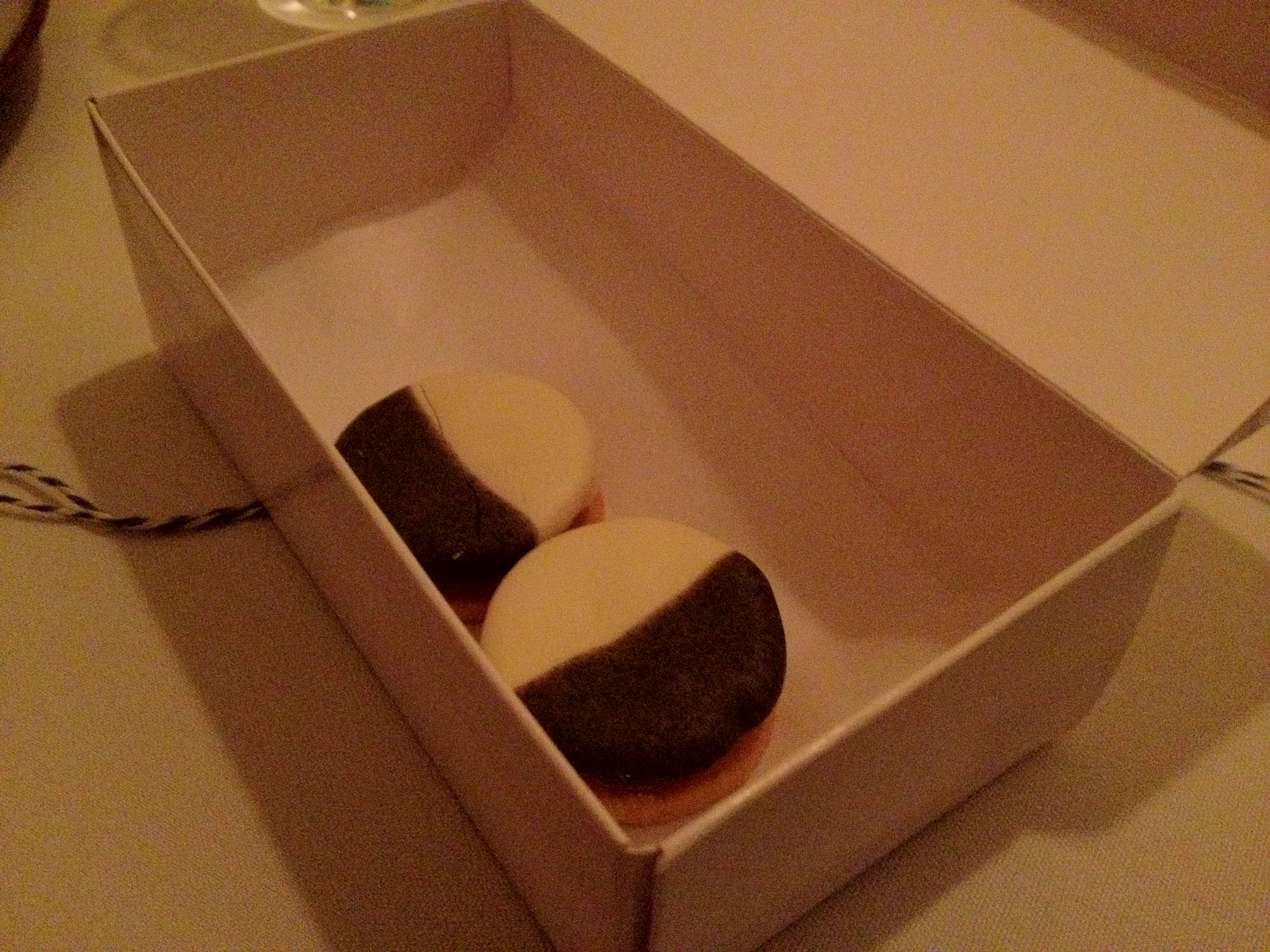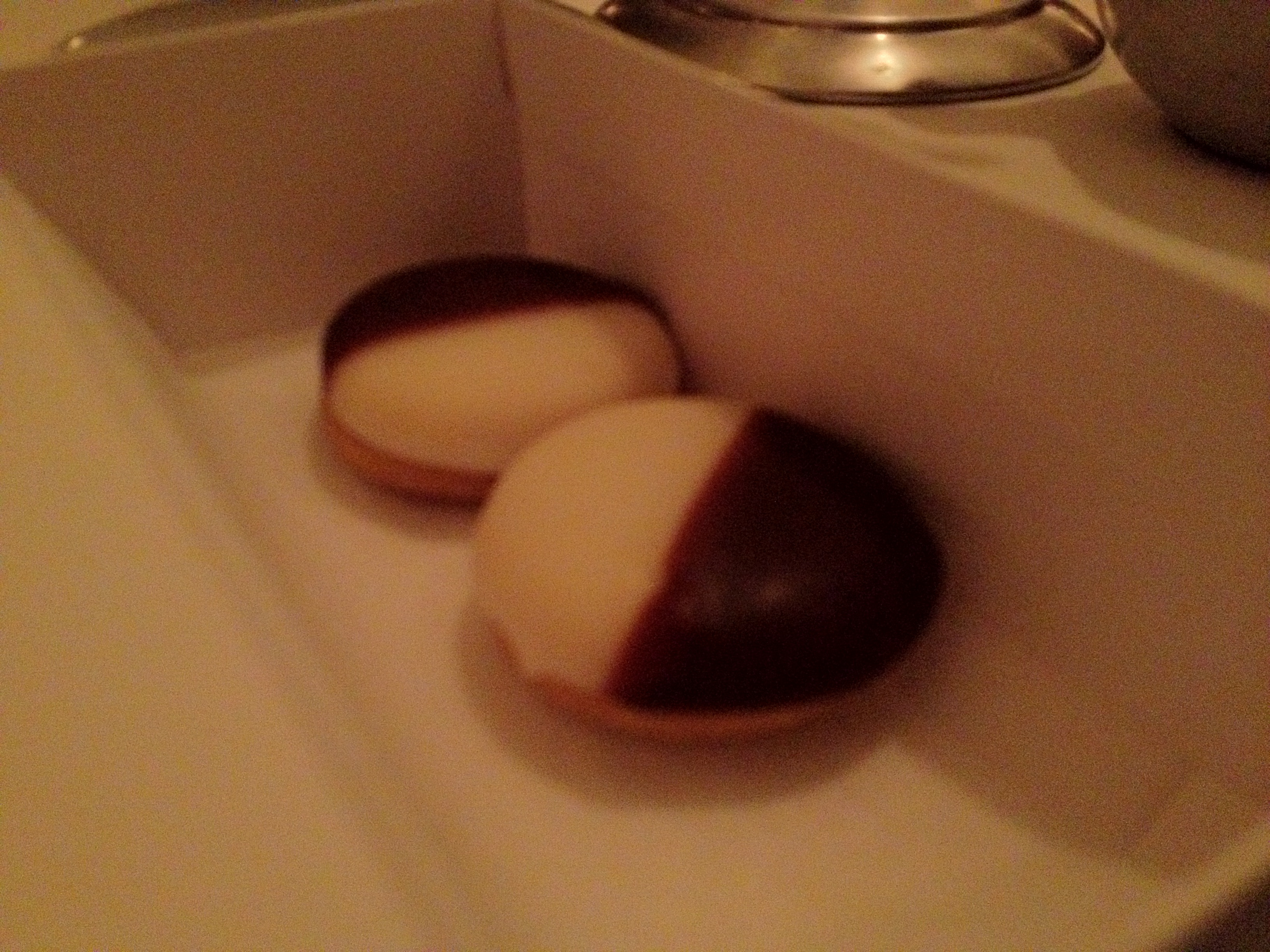 We finished the meal with some applejack, chocolate pretzels, and sweet black-and-white cookies!