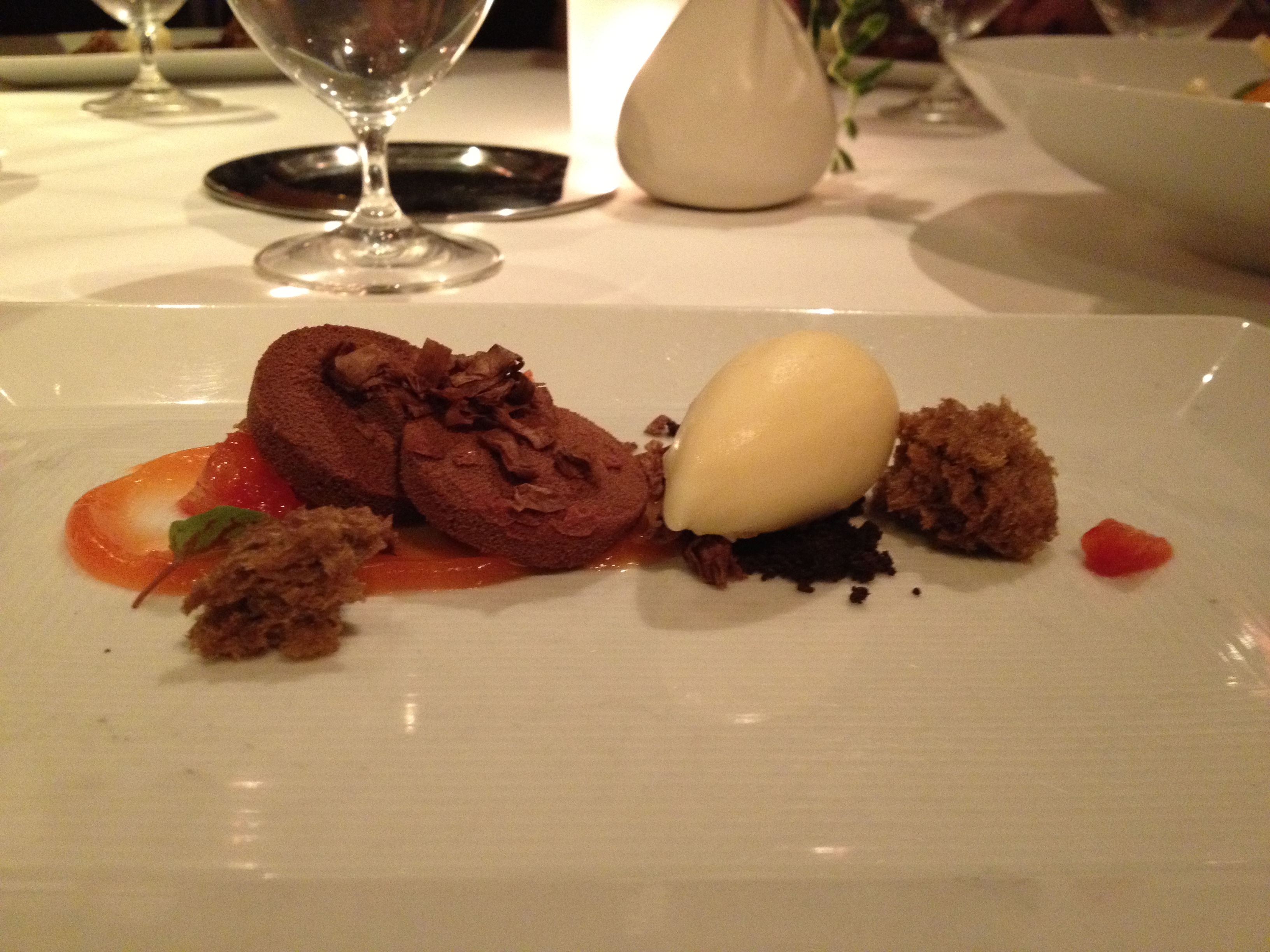 Victor: This was one of the more interesting desserts I’ve had in recent times. The kaffir lime flavor reminded me of Thai food, and the kumquats gave me something delicious to chew on (more texture—yay!) while I enjoyed the coconut dacquoise, tangerine, and kaffir lime taste.
