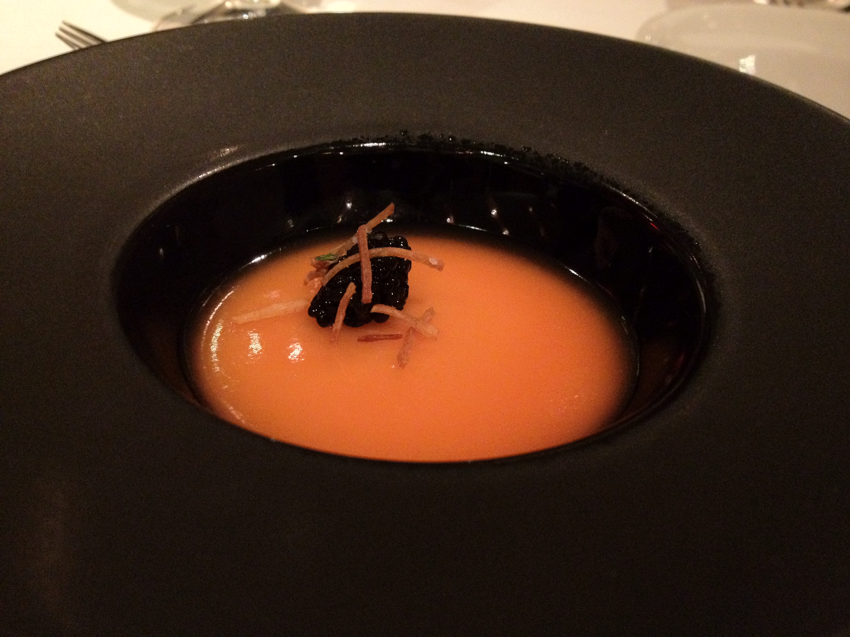 Coconut-and-parsnip panna cotta with blood orange gelée and caviar on top.