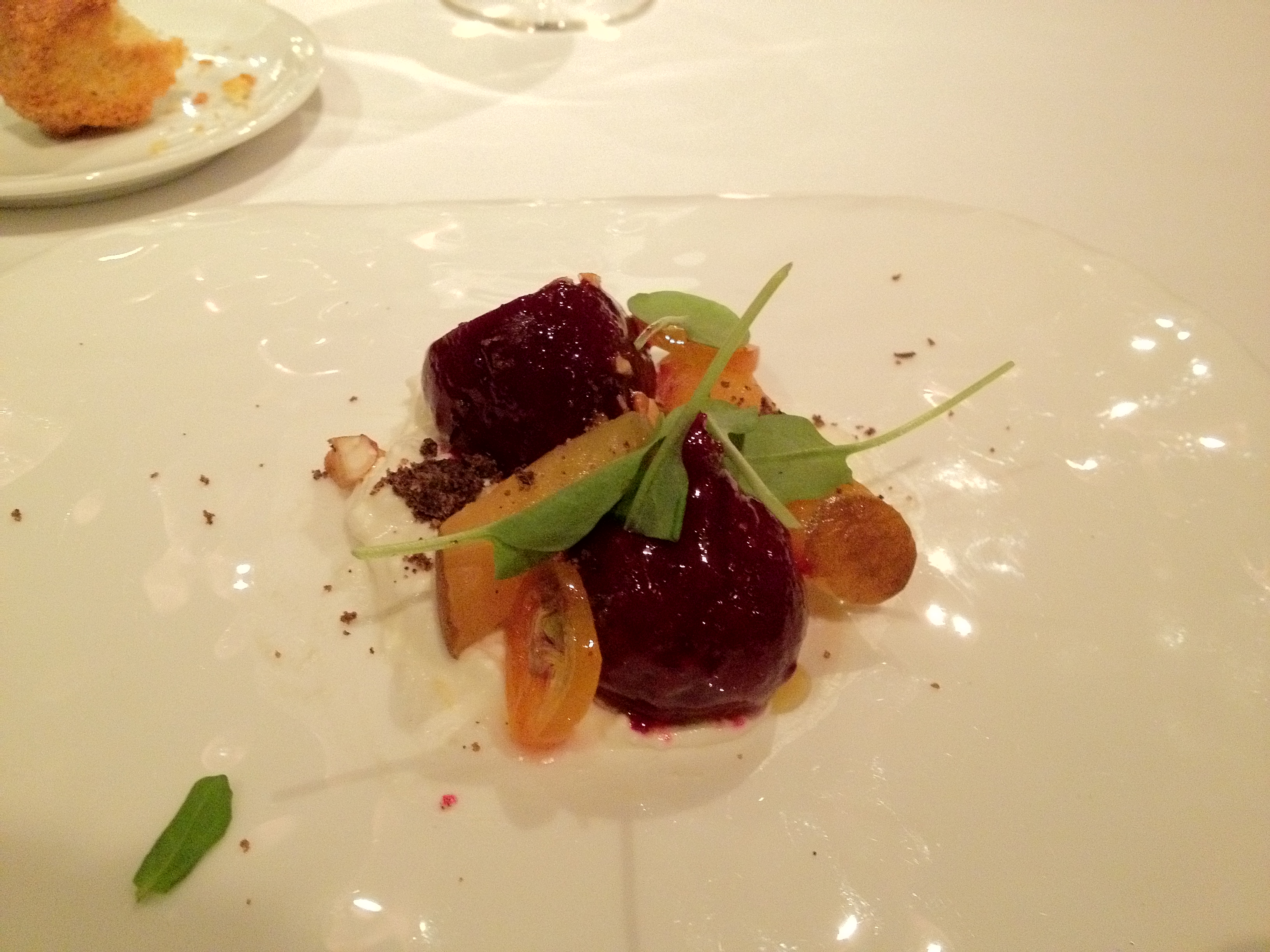 Monte: The beets were amazingly tender and meaty while maintaining their sweetness, and there was a great interesting contrast when the the kitchen added the candied kumquat (thinly sliced orange circle on lower left of the botom beet). The kumquat is slightly sweet but even more tart, and the acidity pleasantly brightened the dish.