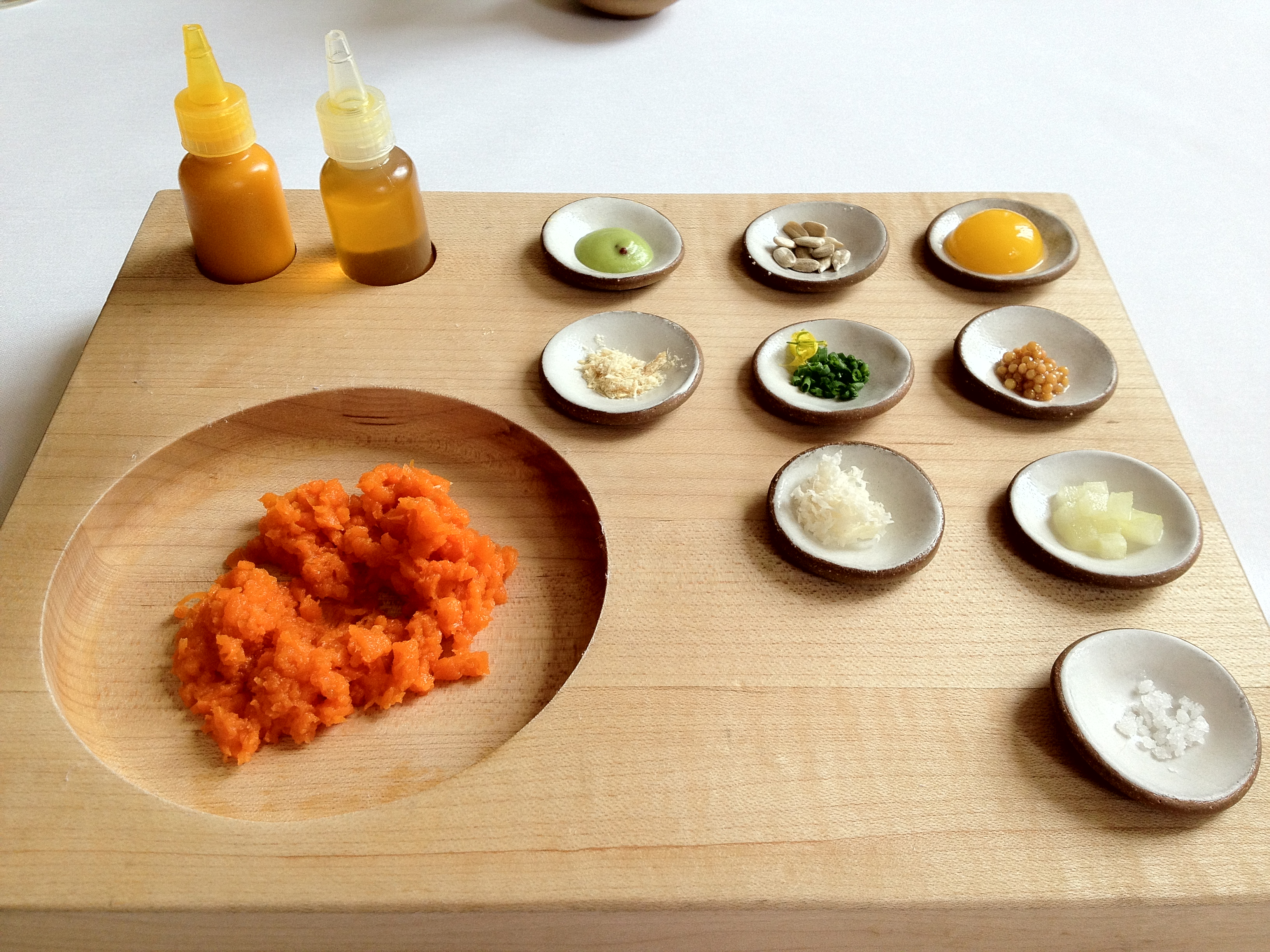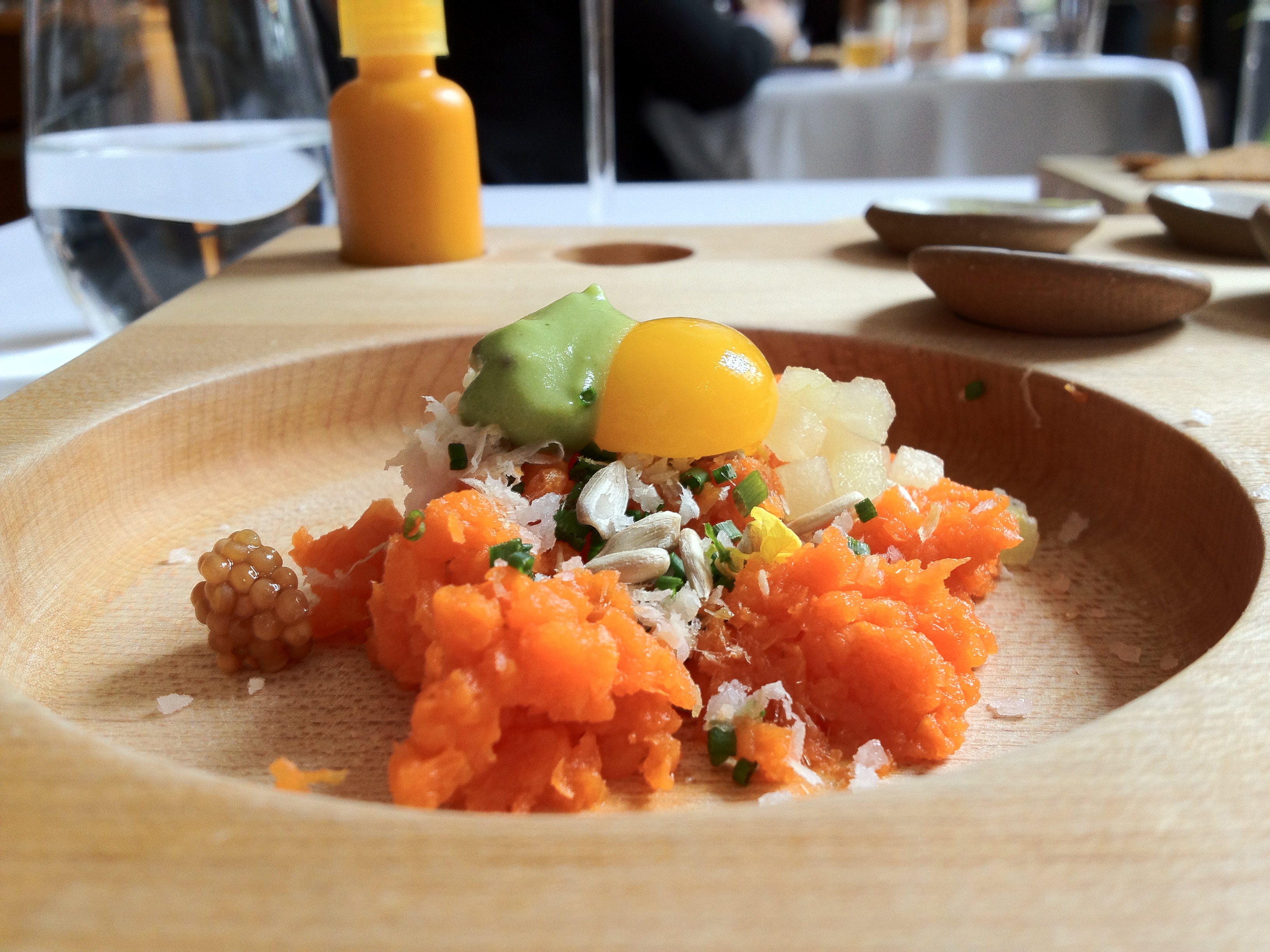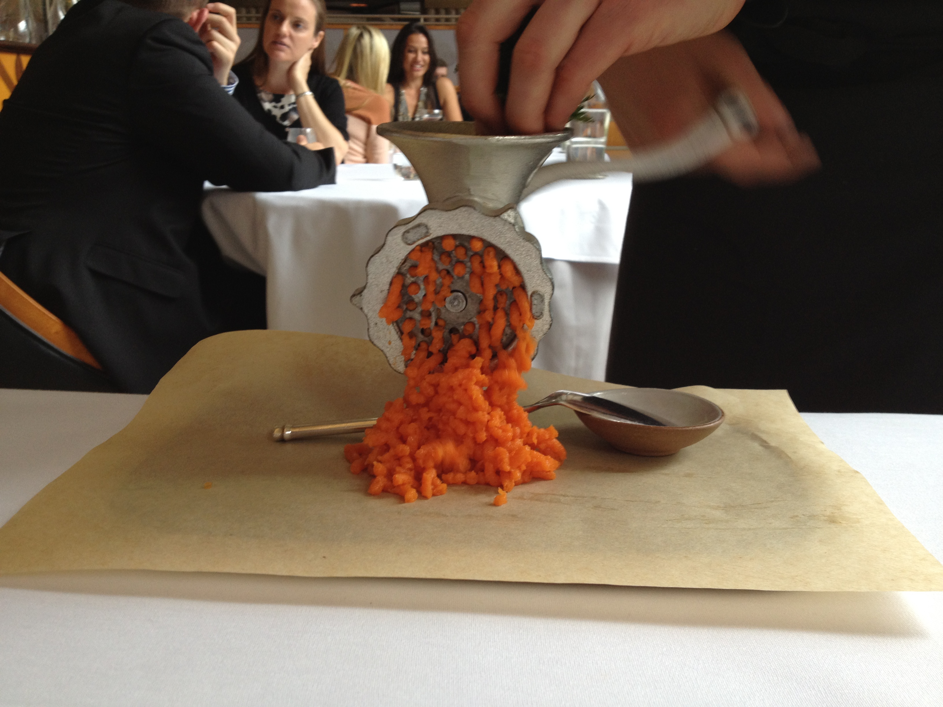 Victor: They set up a meat grinder at our table for this course. Instead of mincing meat, though, they minced carrots!