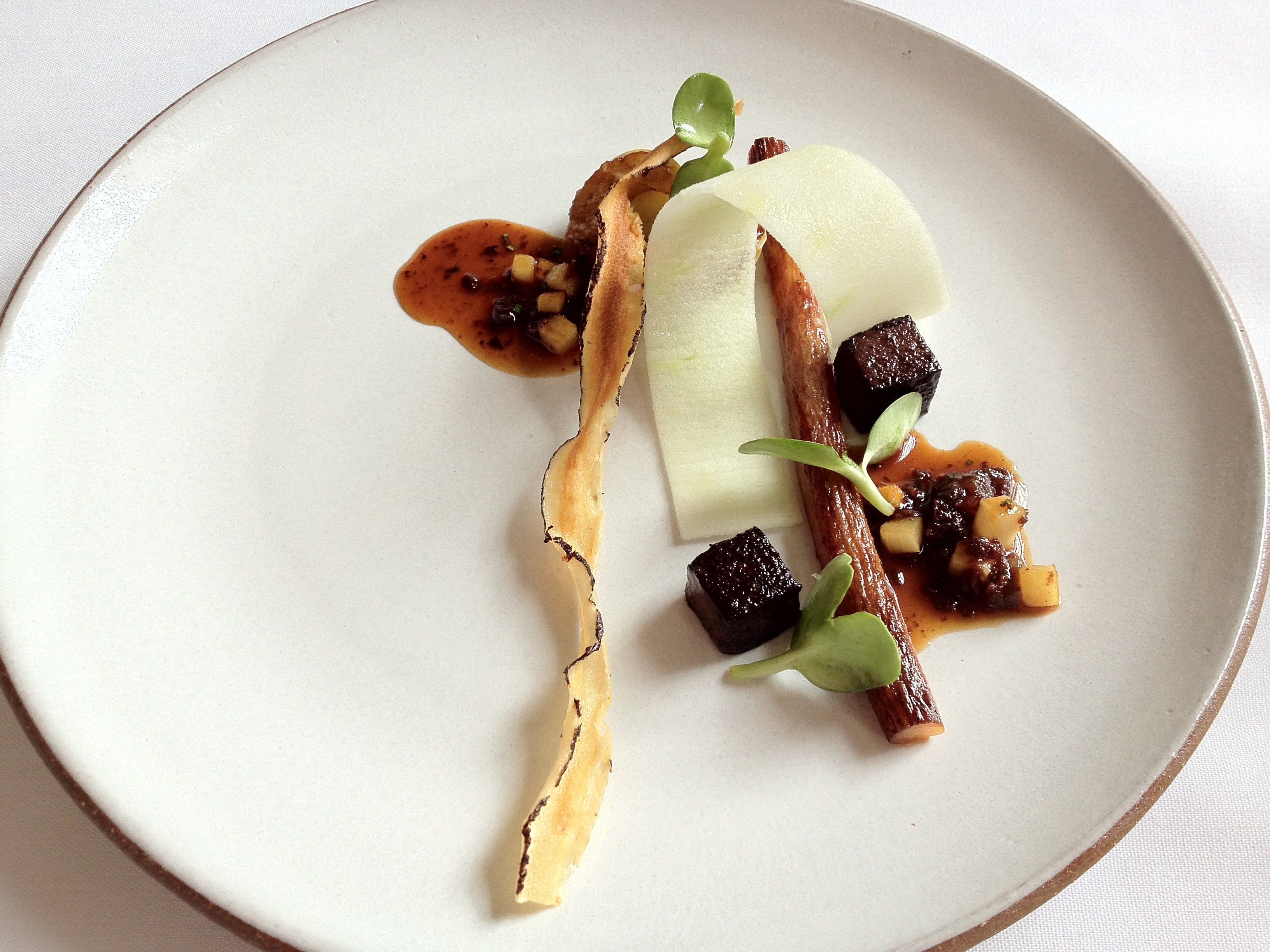 Monte: Looks like a twig, but tastes much better. The salsify texture was kind of like a taffy candy, with its chewiness. The jus alongisde it was really rich and worked well with lighter elements of the other dish.