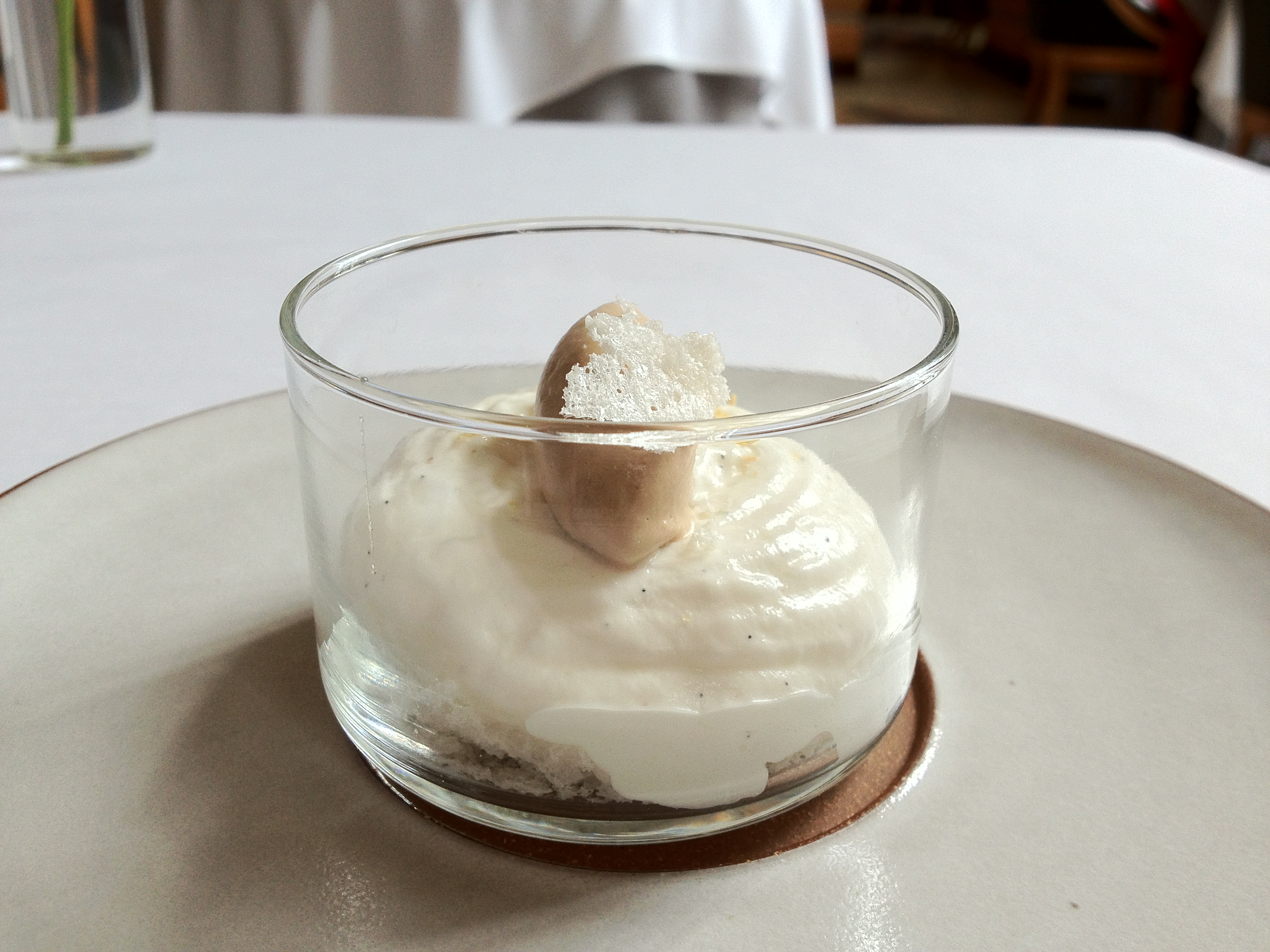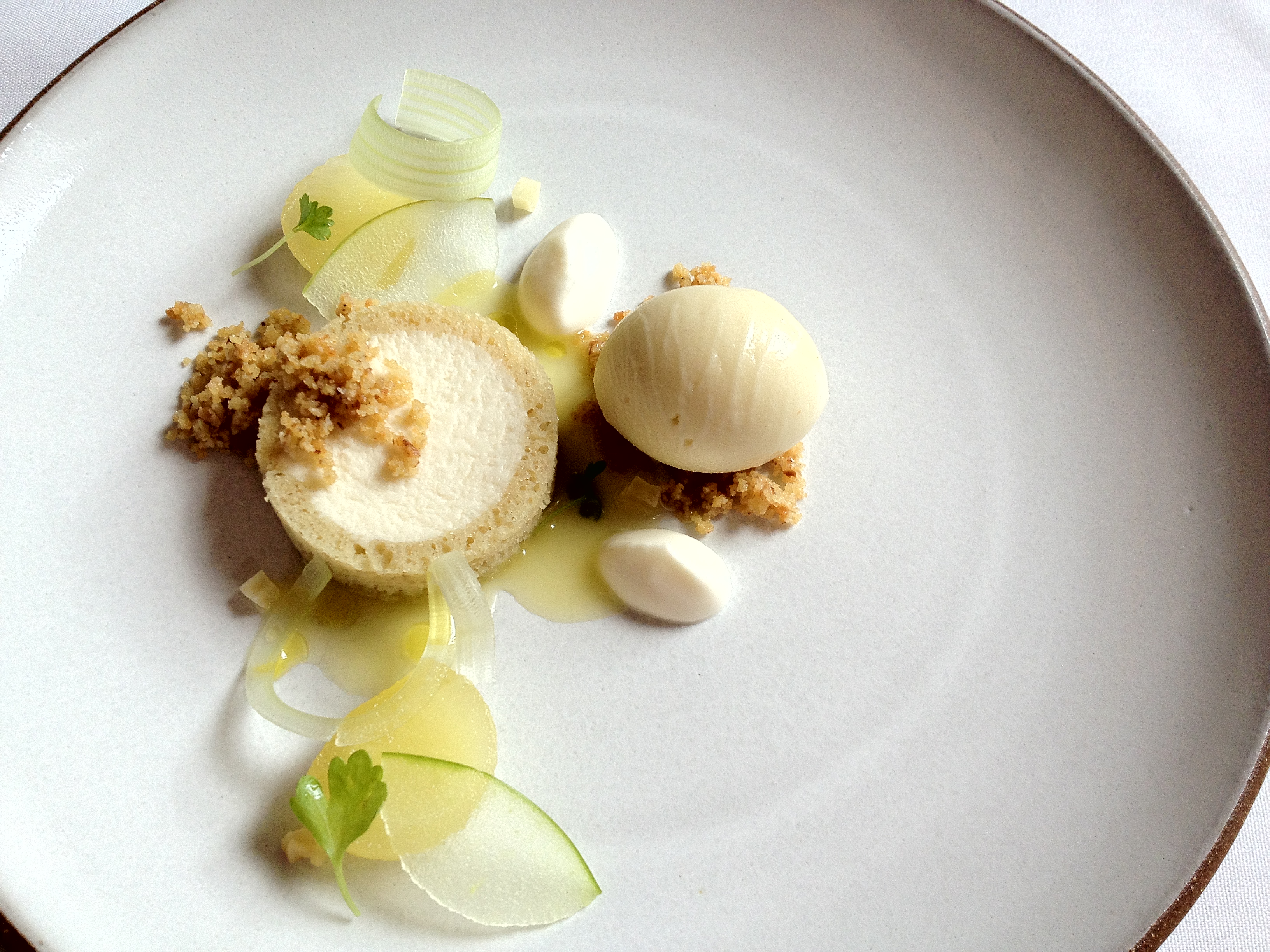 “This was a really interesting dessert. The taste of the celery was pretty strong, and the apple sorbet provided a slightly sweet flavor profile that complemented the celery. There were also really thin slices of apple that were probably marinated in celery juice. The texture was that of apple, but the flavor was that of celery. This seemingly simple dessert was definitely more deceptive than one would think haha. The dessert was sweet overall, but it wasn’t overpowering, and it was a dessert that my mom, who doesn’t like foods that are too sweet, enjoyed a lot.”