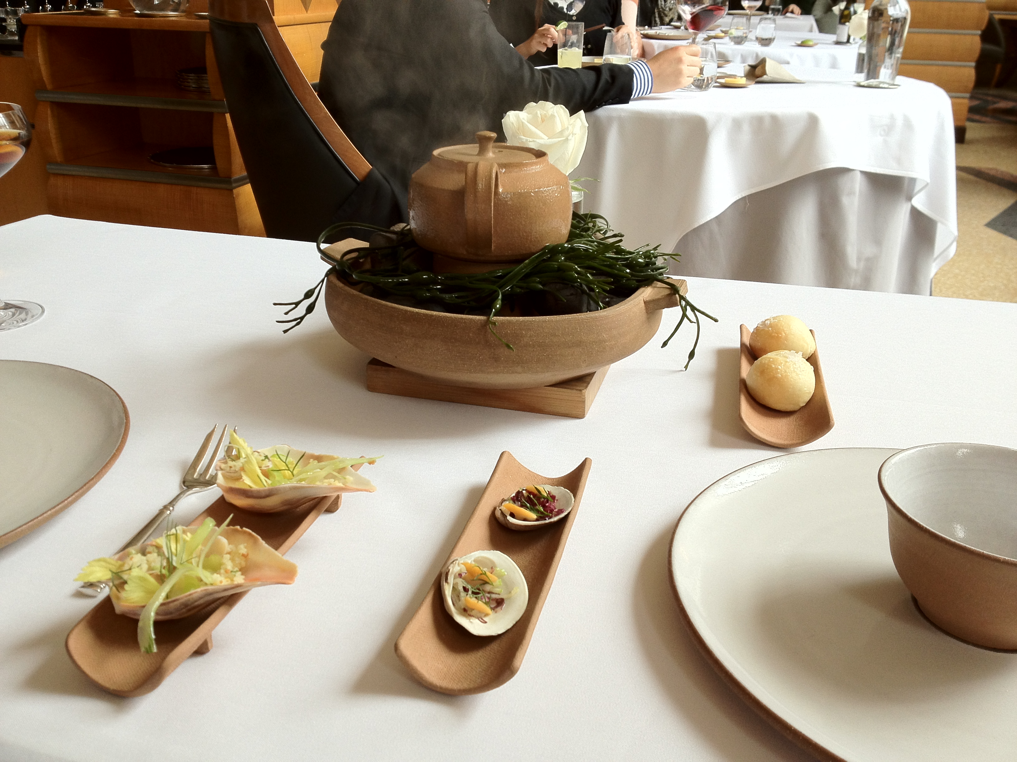 Monte: I LUUUUURVE seafood so the surf clam, along with this clam bake, was an amazing sequence for me. The hot water they pour over the hot stones underneath the chowder-filled-teapot steamed up and hit the bed of seaweed, creating this heavenly oceanic fragrance that percolated through our table’s area. I actually felt like I was standing in the middle of the ocean, and it was awesome. Oh and of course, the clams tasted amazing.