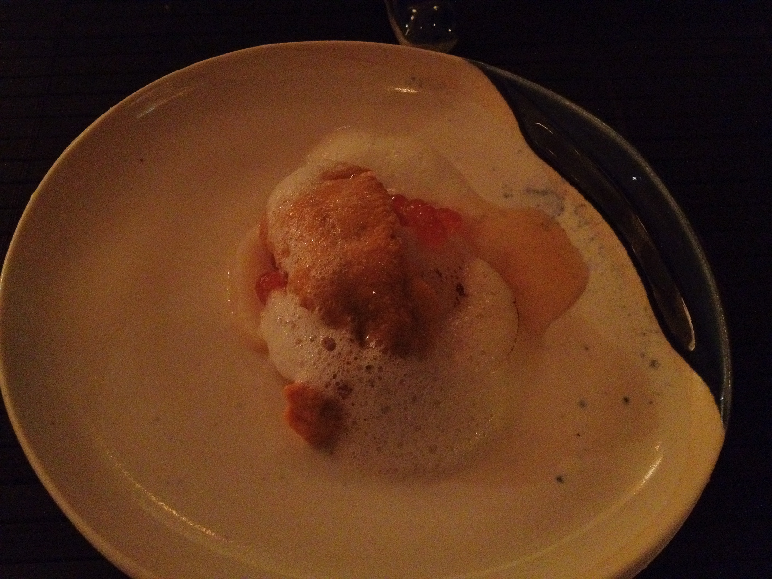 Chilean uni (sea urchin), ikura (salmon roe) marinated in dashi, and Hokkaido hotate (sea scallop). Topped with yuzu foam.