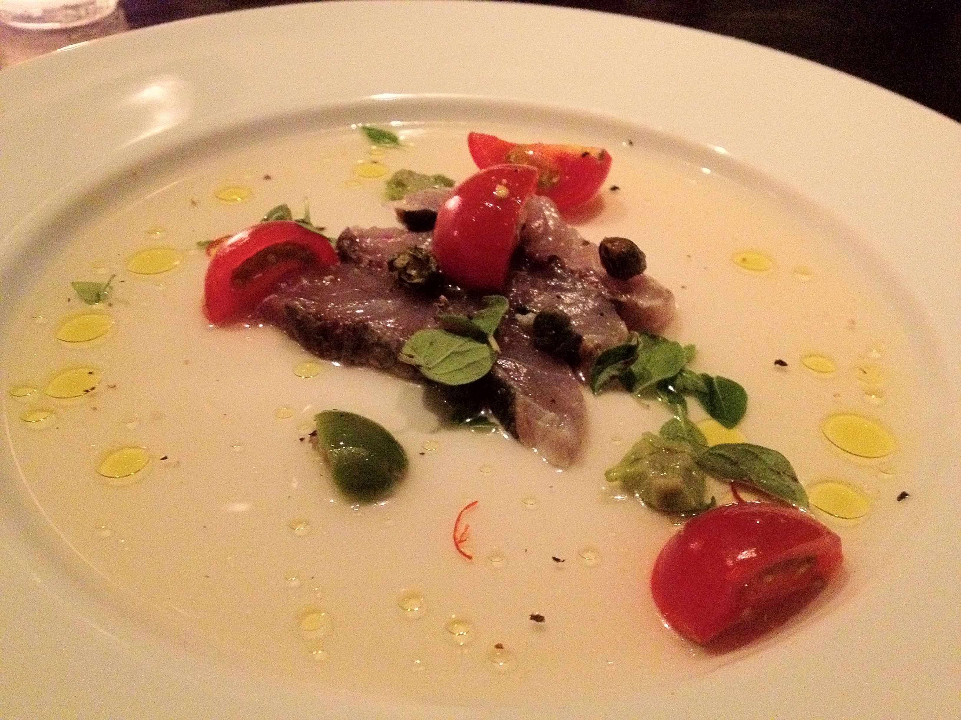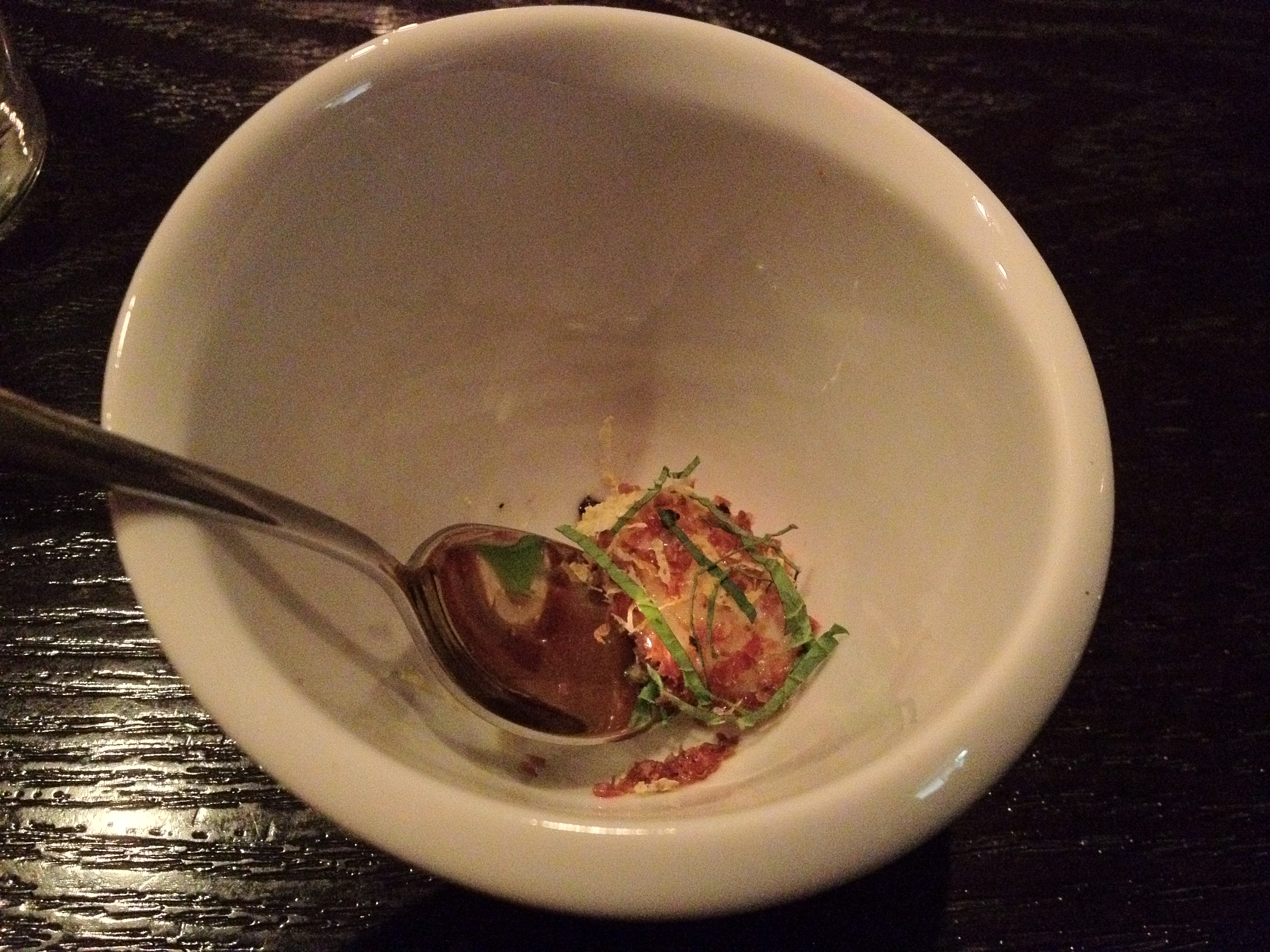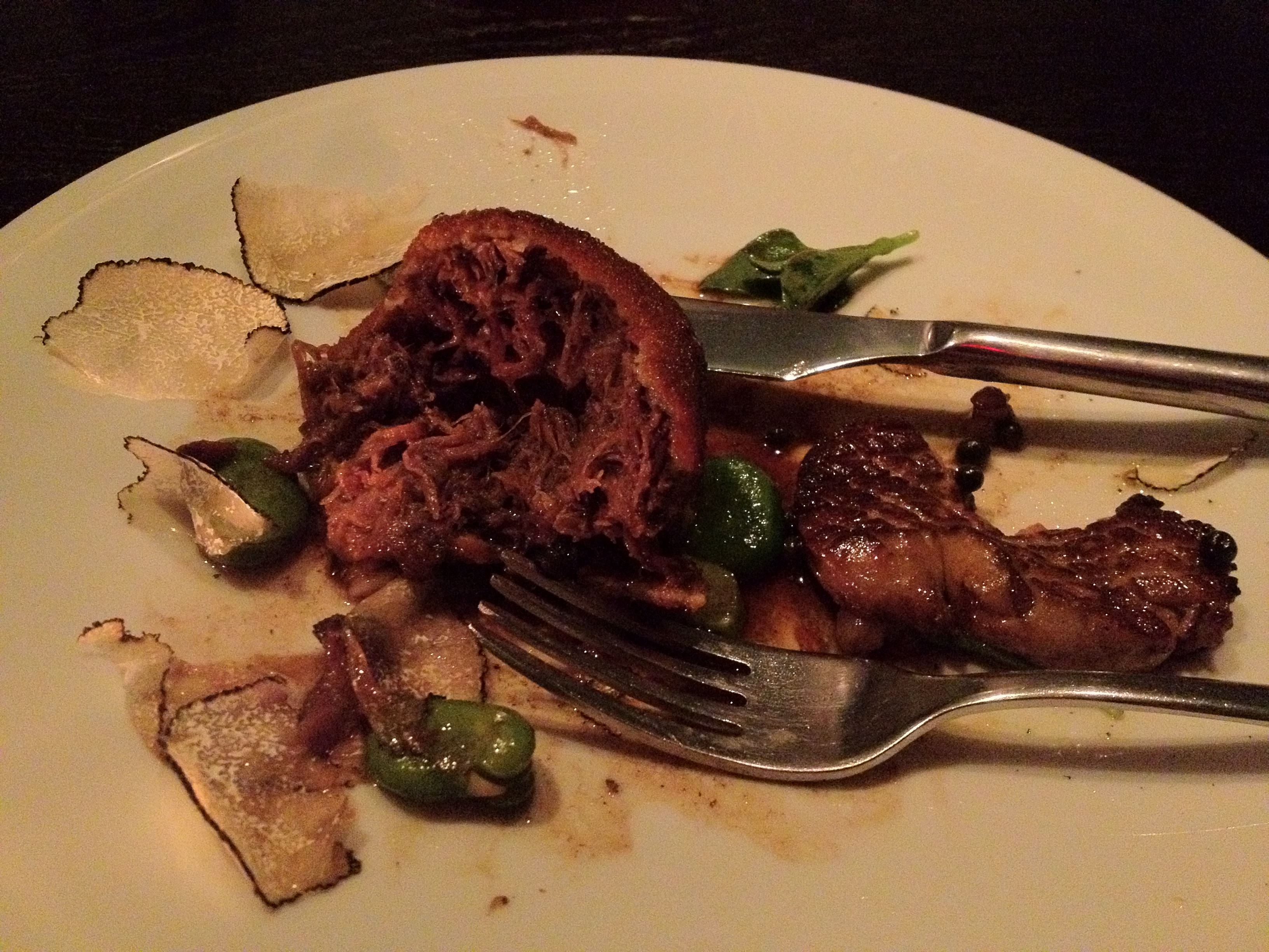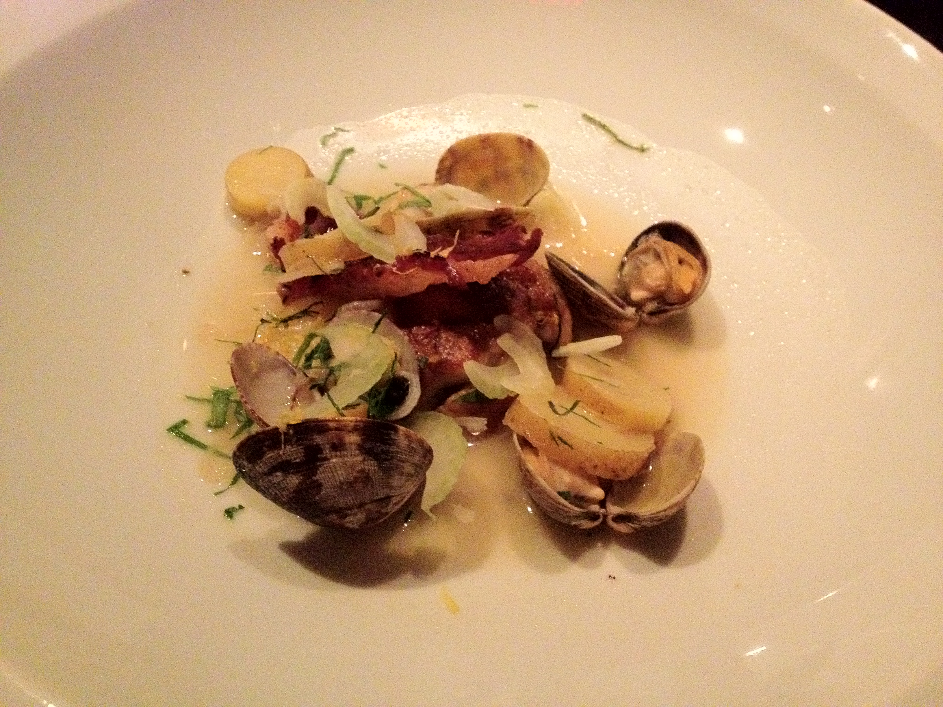 Maria: This dish was a good rendering of clam chowder suited for a hot summer day. It was lighter and not as rich. The sweetbreads were delicious, but I think both and sweetbreads and the bacon on top could have been a little crispier–maybe my mistake for not eating them first.