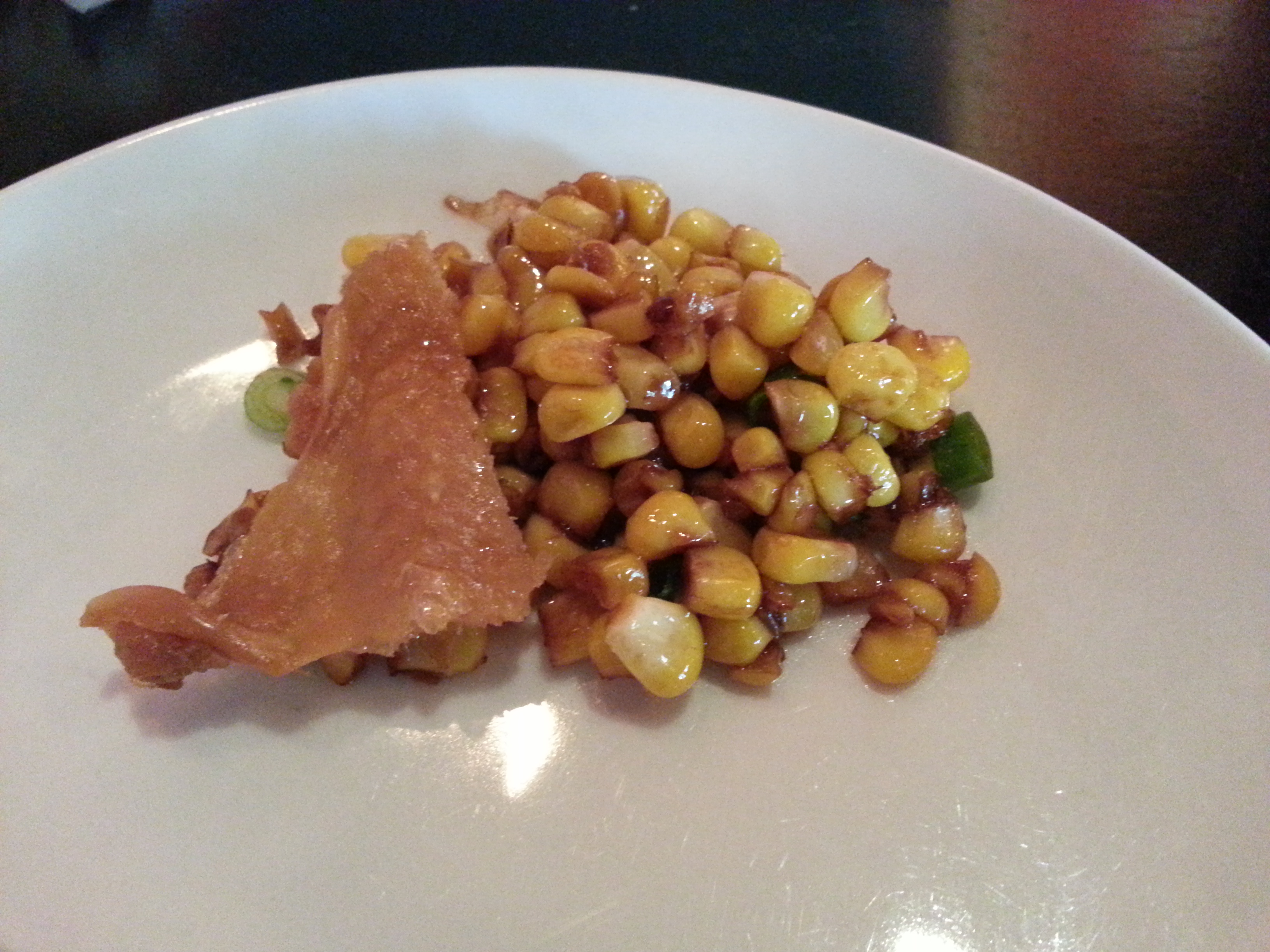 Course 1: Pan Roasted Corn, Tare, Crispy Chicken Skin, Scallion