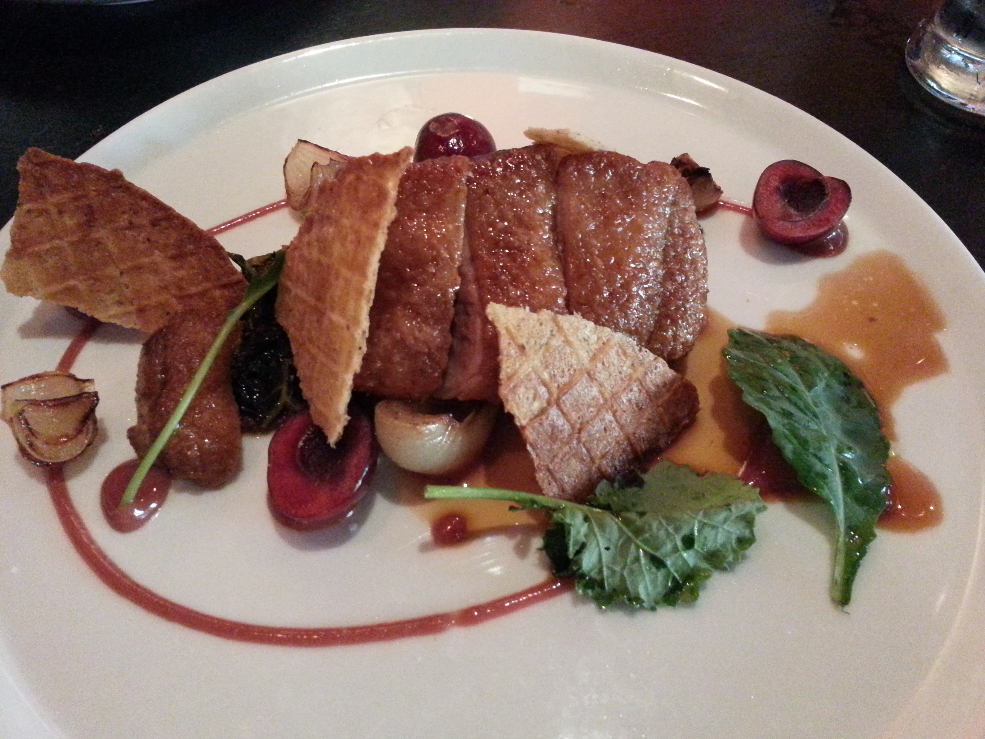 Course 5: Duck Breast, Cherries, Kale, Poultry Jus, Black Pepper Waffle Crispies