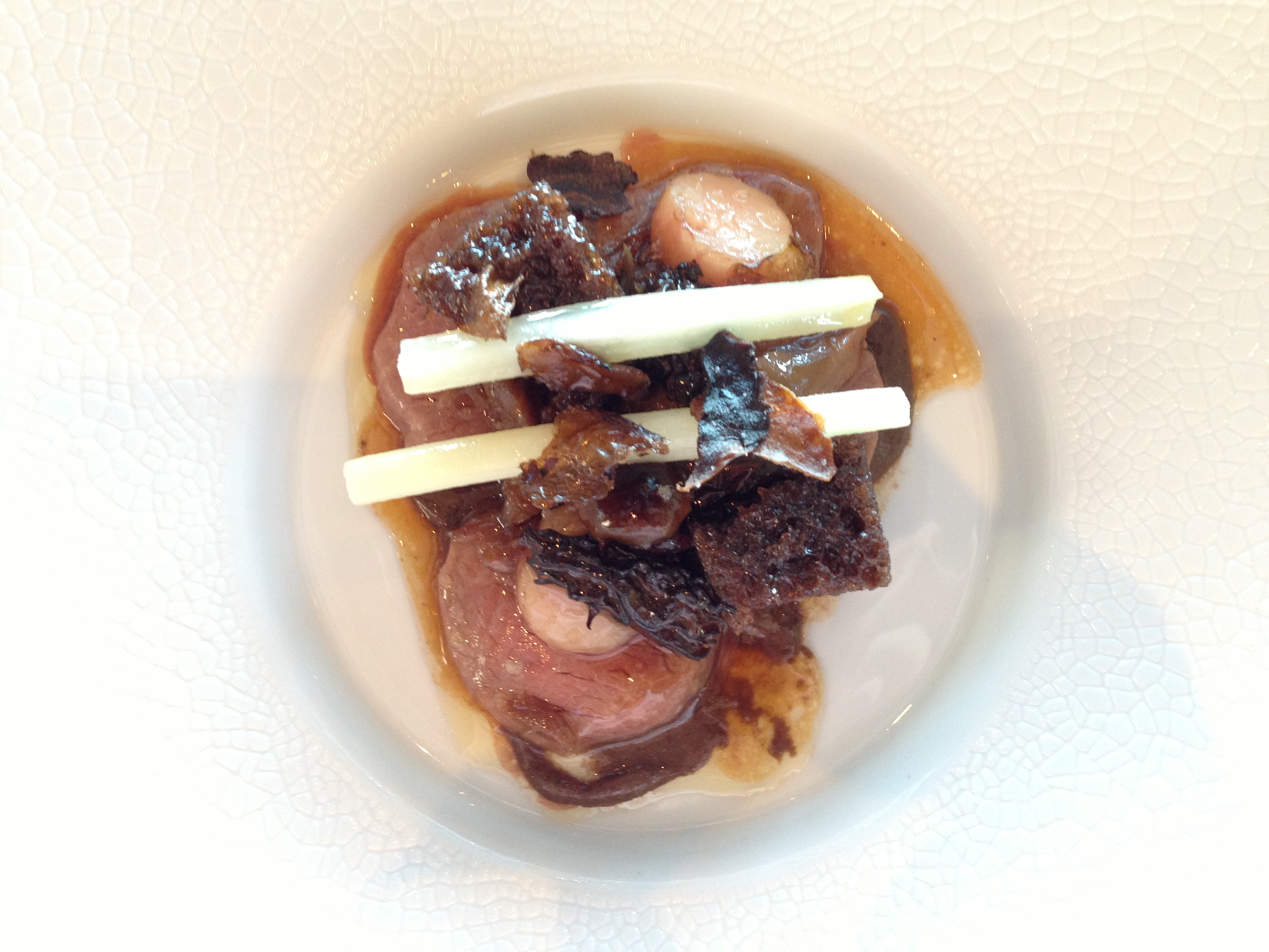 Mmm, wallaby tail! This was another very, very rich course. They were really ramping up in the intensity of flavor and richness at this point. I didn’t mind, though—everything was delicious! The veal and wallaby tail were juicy, the chocolate brioche added a hint of sweetness that cut down on the richness somehow, and the smoked bone marrow added more welcome richness. The salsify and chestnut mushrooms rounded out the flavor profile of the overall dish, and they also served to provide some textural contrast to the meats and brioche. The combination of ingredients in this dish was pretty amazing.