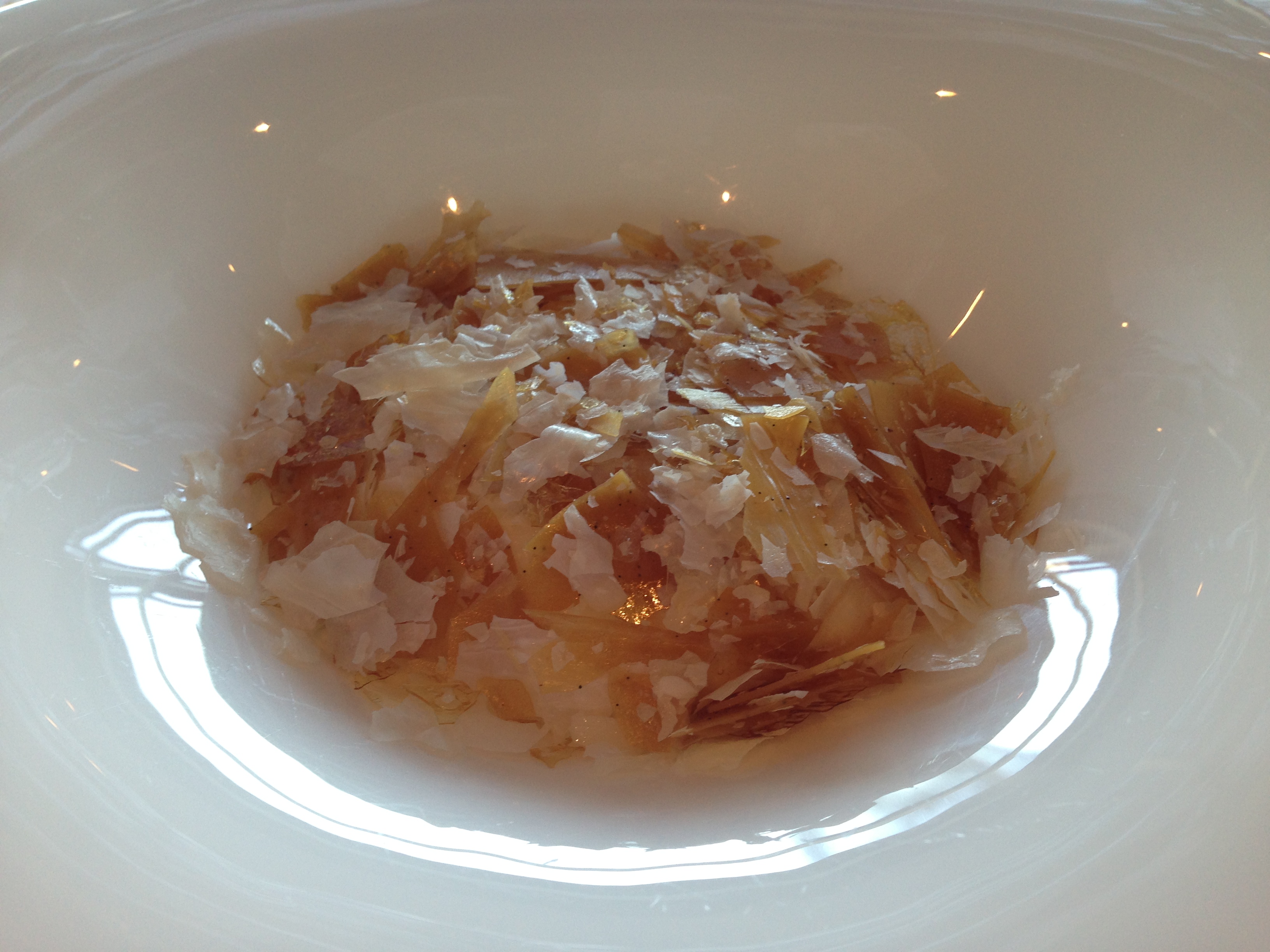 This dish was pretty much rich, chewy Wagyu combined with light horseradish juice, flavorful but light sour cream, and crispy and light milk skin. The John Dory roe added a hint of seafood, but this dish was pretty much focused on earthiness. The Wagyu was tender and chewy (though it wasn’t as good as, say, Wagyu from Kobe or Matsusaka), and the other four ingredients pretty much served to both complement the Wagyu and help refresh the palate.