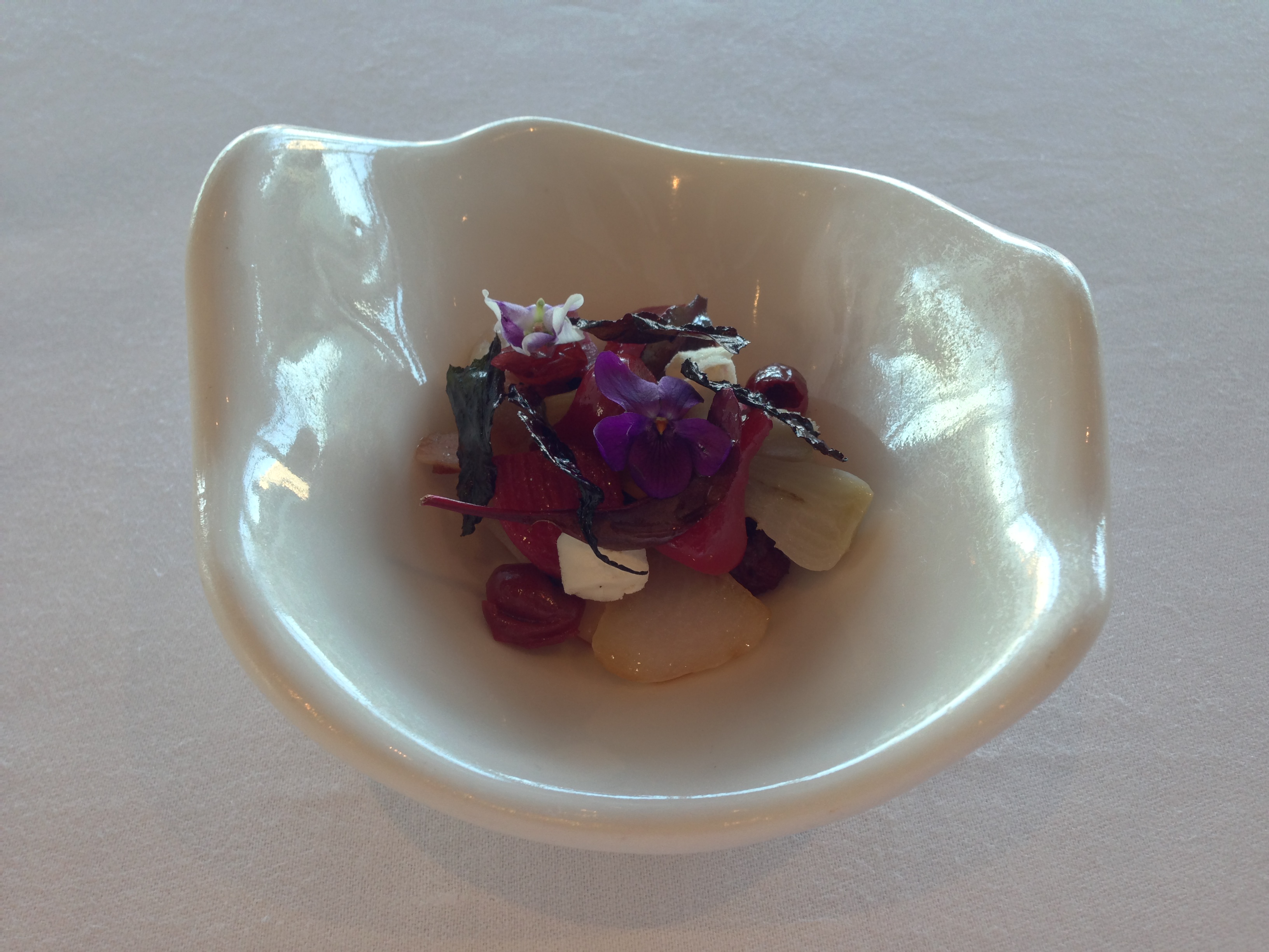 Salad of albino and Chioggia beetroots, preserved wild cherries, goat’s curd, scorched beet leaves, sourdough bread soaked in pomegranate molasses, and violets.