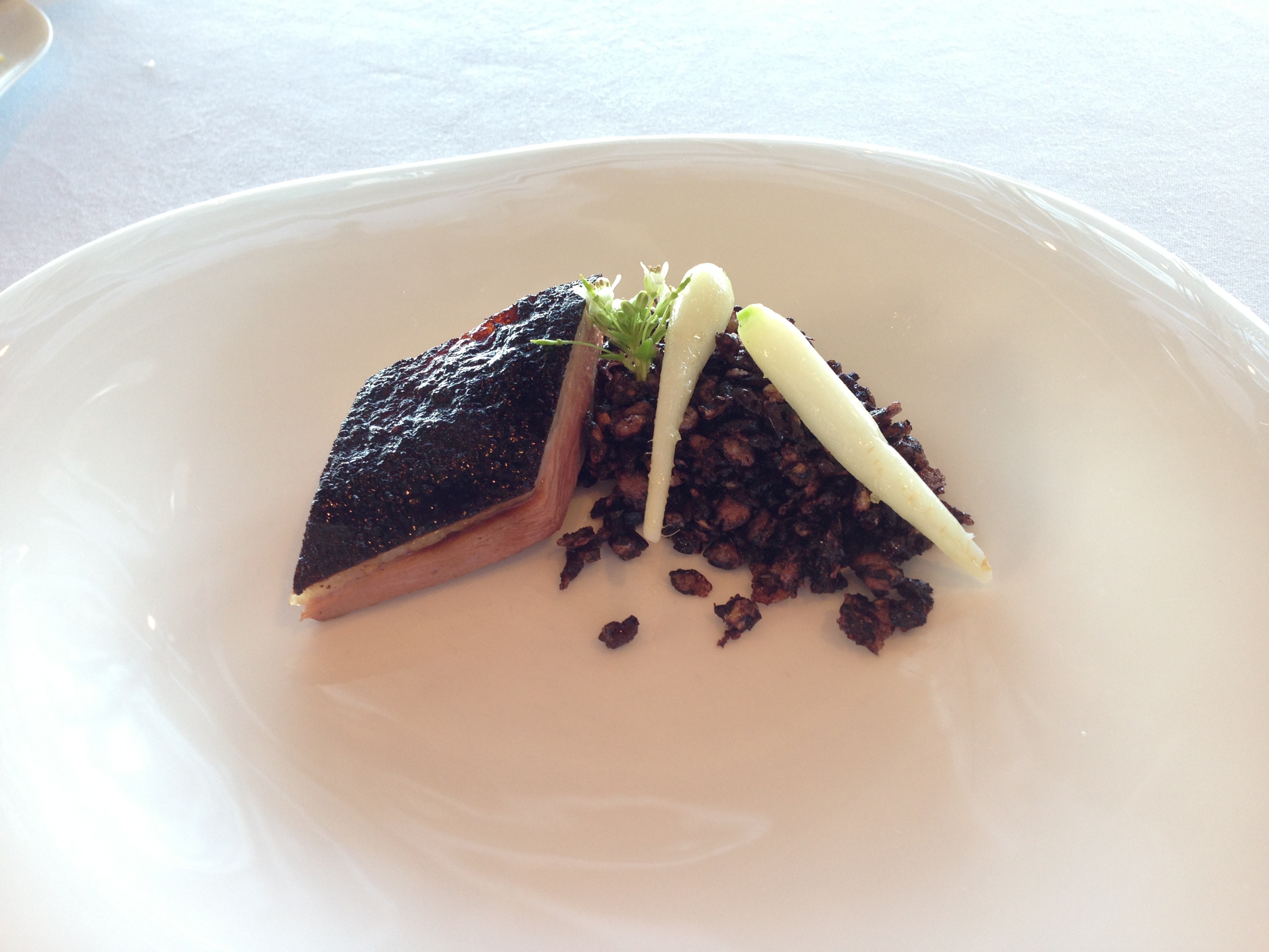 Roasted goose, forbidden rice (black rice), black miso, and hatsuka radish.