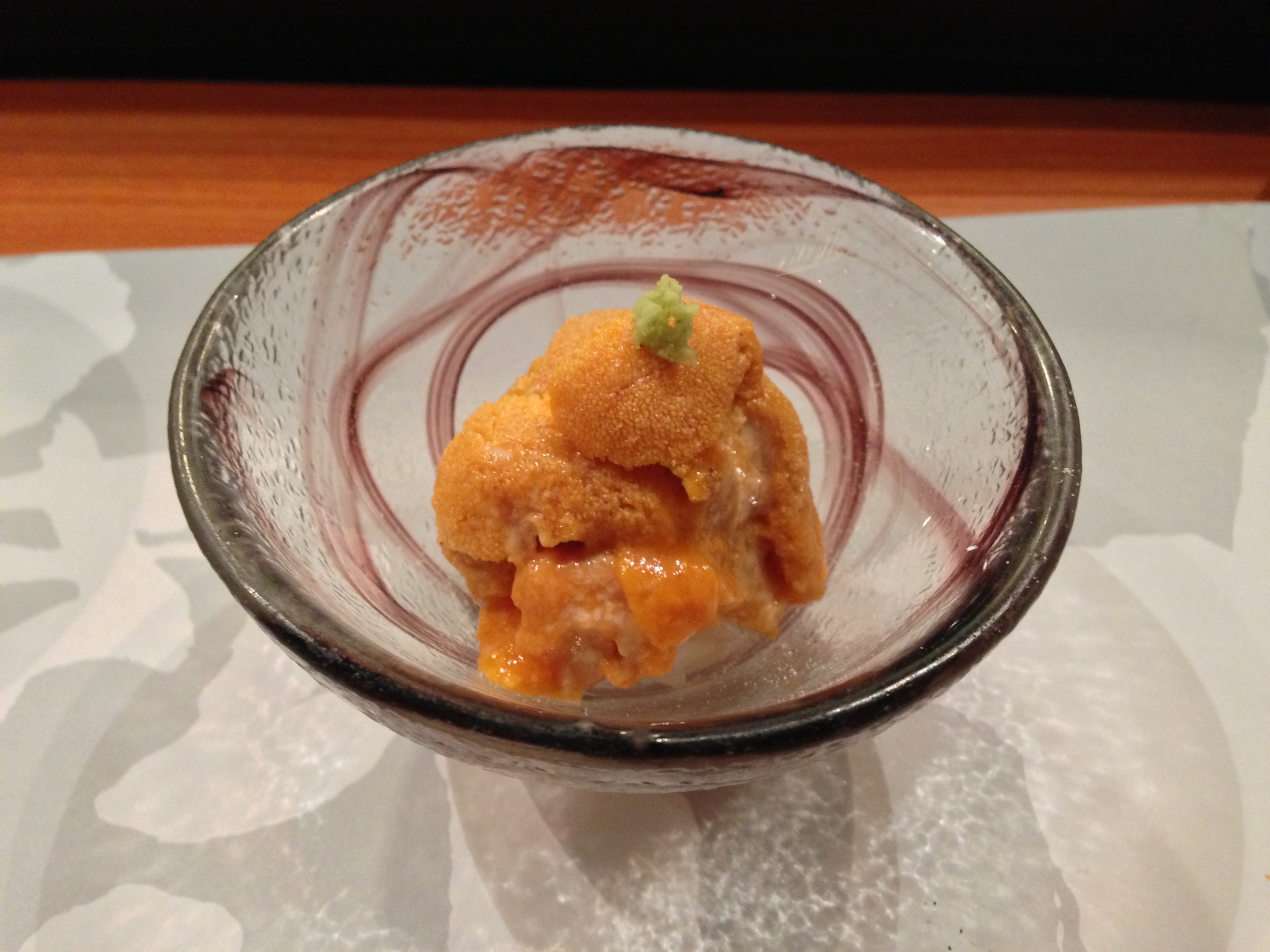 I asked Ivan why he serves it without seaweed and in this manner, and he replied that the seaweed they use overpowers the taste of the uni. Hmm… (Then use better seaweed!)