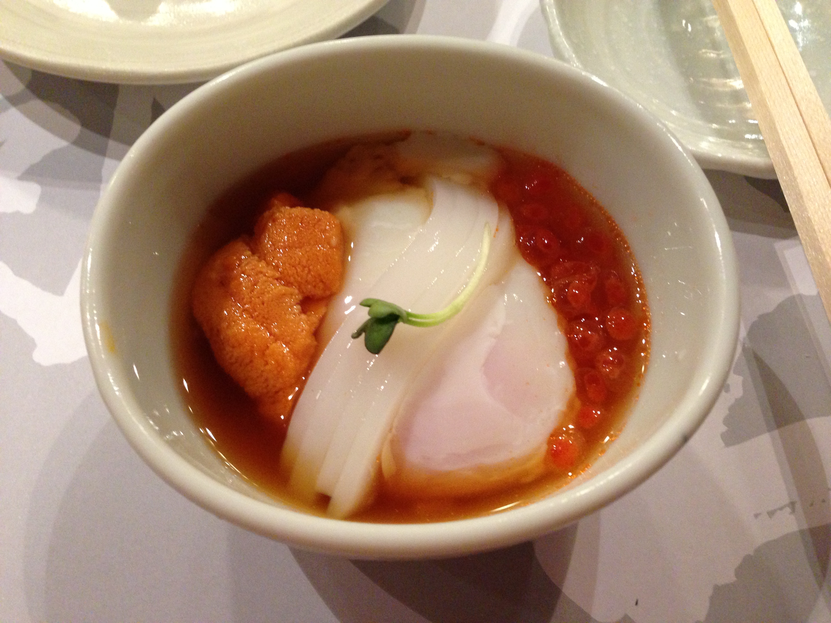 Onsen tamago (“hot spring egg”) with uni (sea urchin), ikura (salmon roe), and ika (squid).
