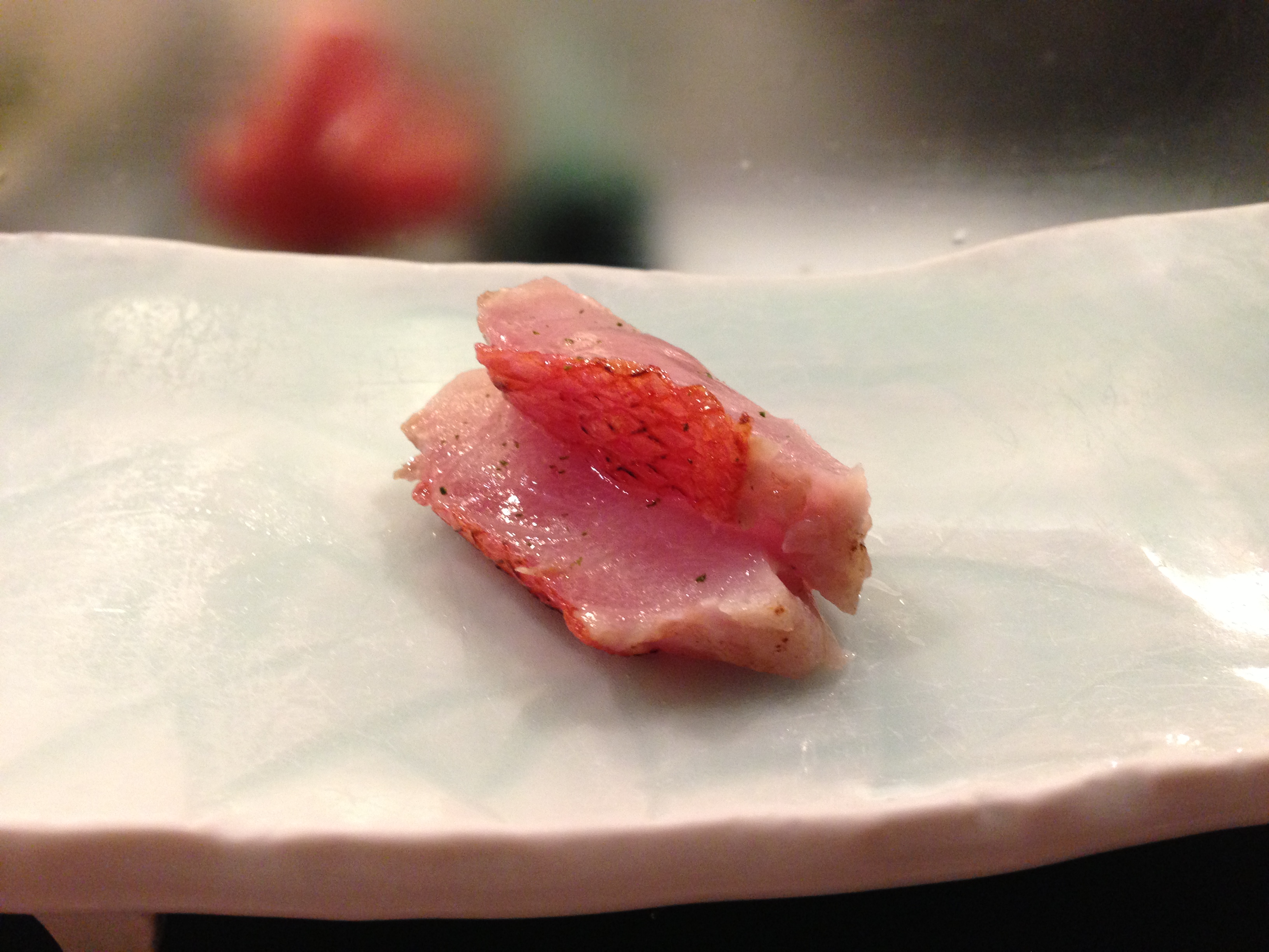 This was also delicious! The skin provided a slight crispness and bite to the sashimi, which tasted very fresh. I might be biased in my thoughts of this, though—I’m partial to kinmedai!