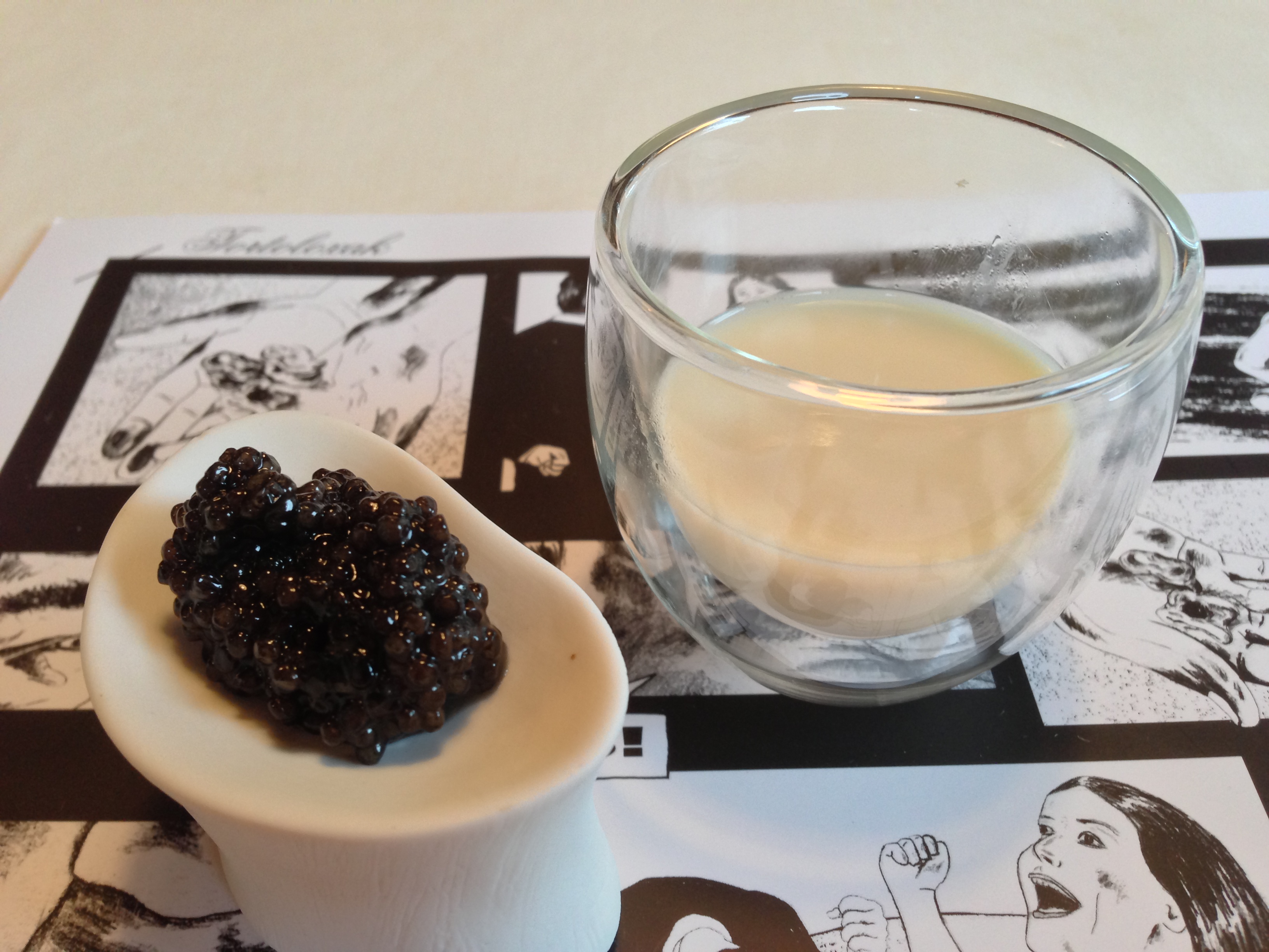 “Poultry Royale” (a custard that was made by mixing chicken consommé with egg yolk) and caviar.