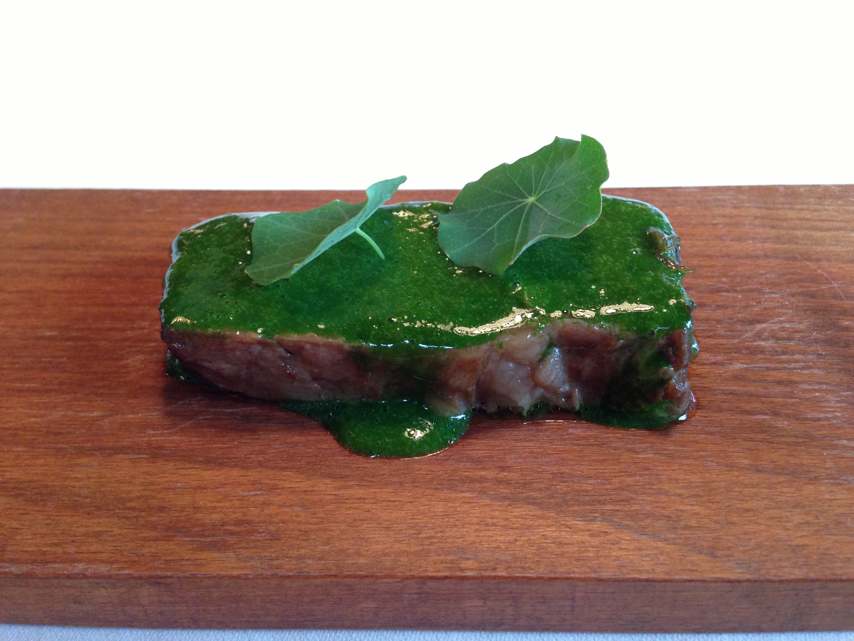 Slow-cooked veal brisket with puréed spinach.