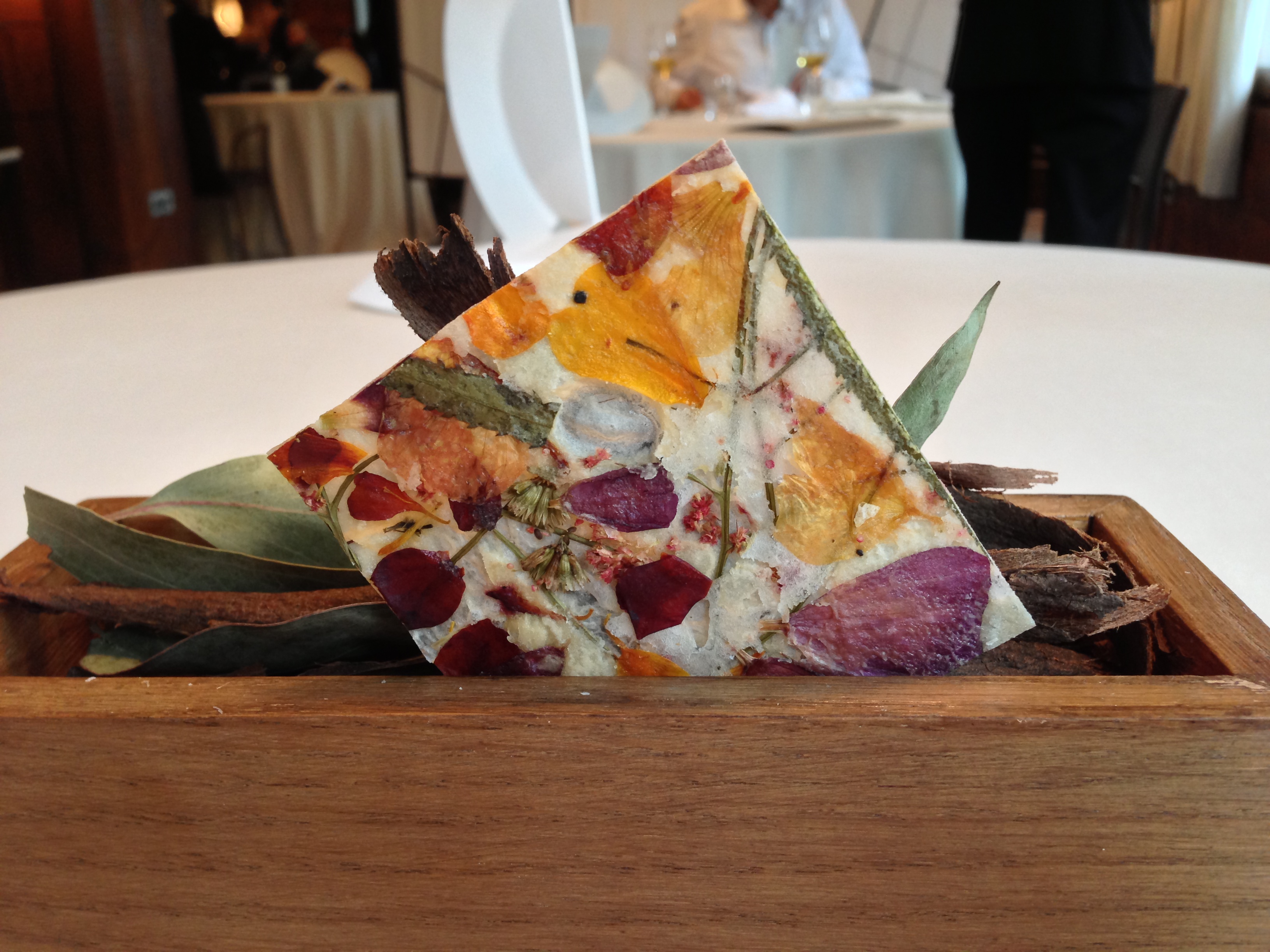 The paper tasted like a light chip, and each bite had a different taste due to the herbs and flowers that were spread throughout the chip.