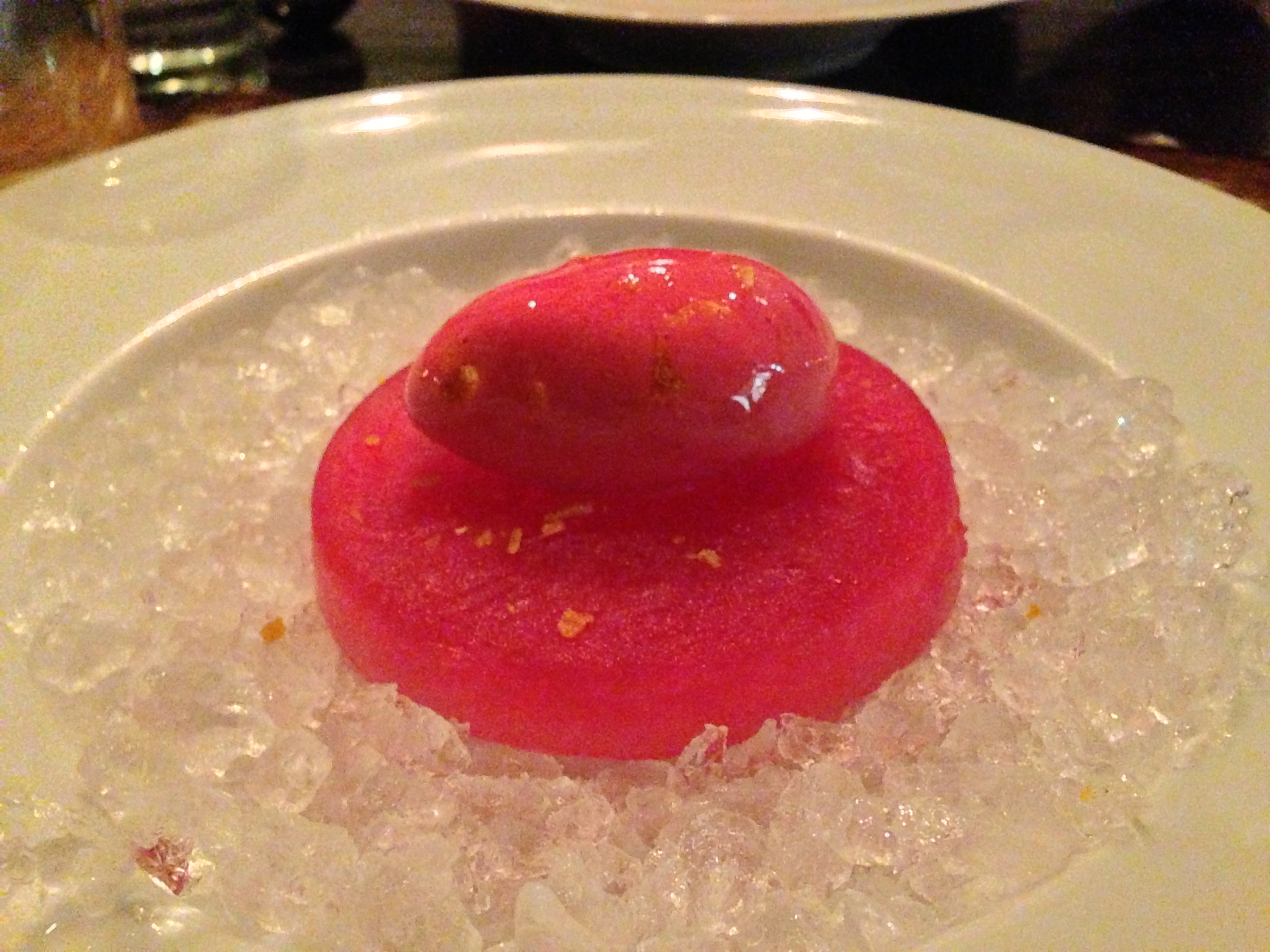 Cranberry sorbet, orange confit, and… something they sprayed the sorbet and flavored ice block with.