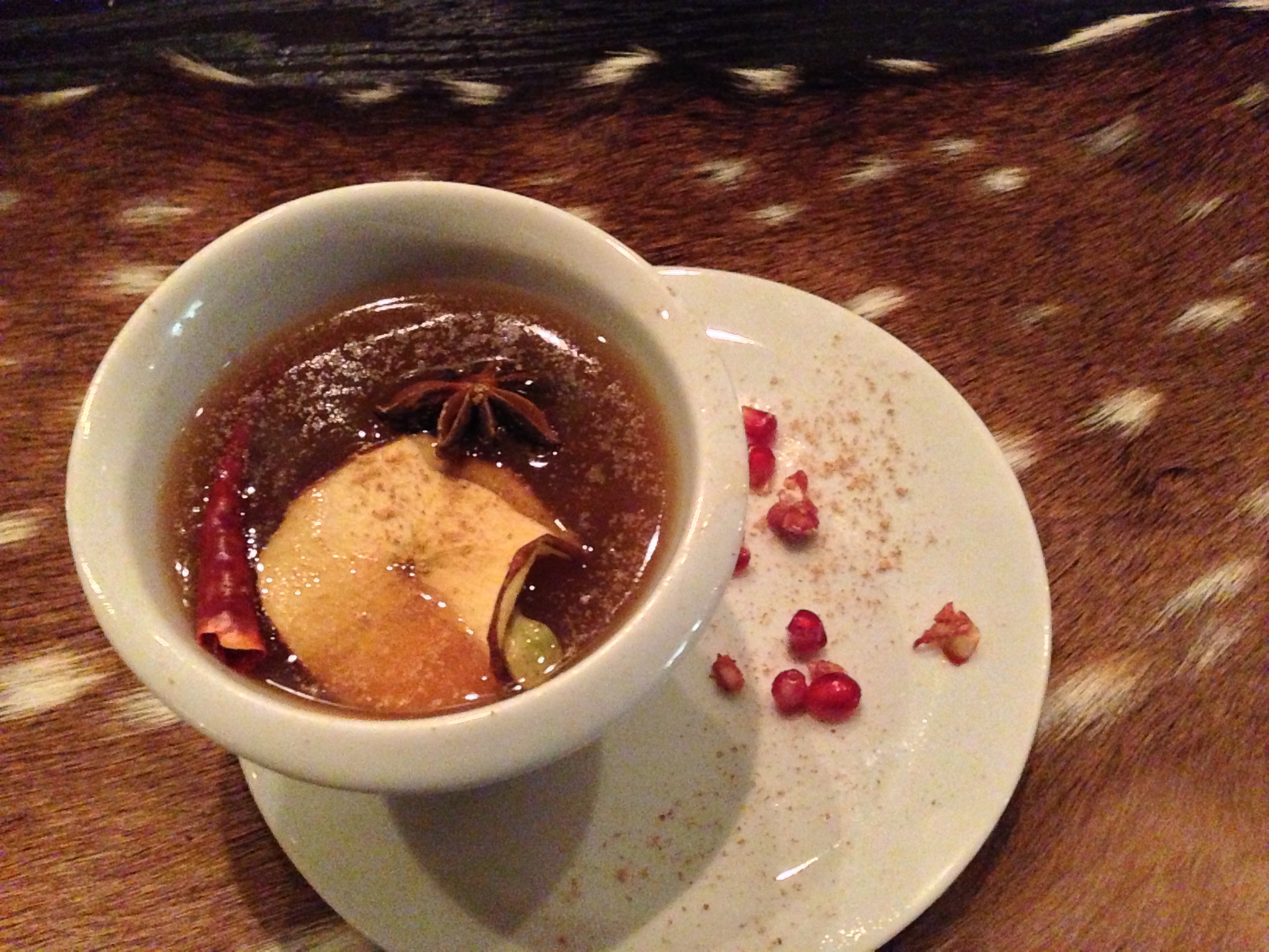Hot reposado tequila, apple cider, apple butter, amaretto (almond liqueur), pear liqueur, apricot liqueur, and hard spices. Served warm with shaven nutmeg.