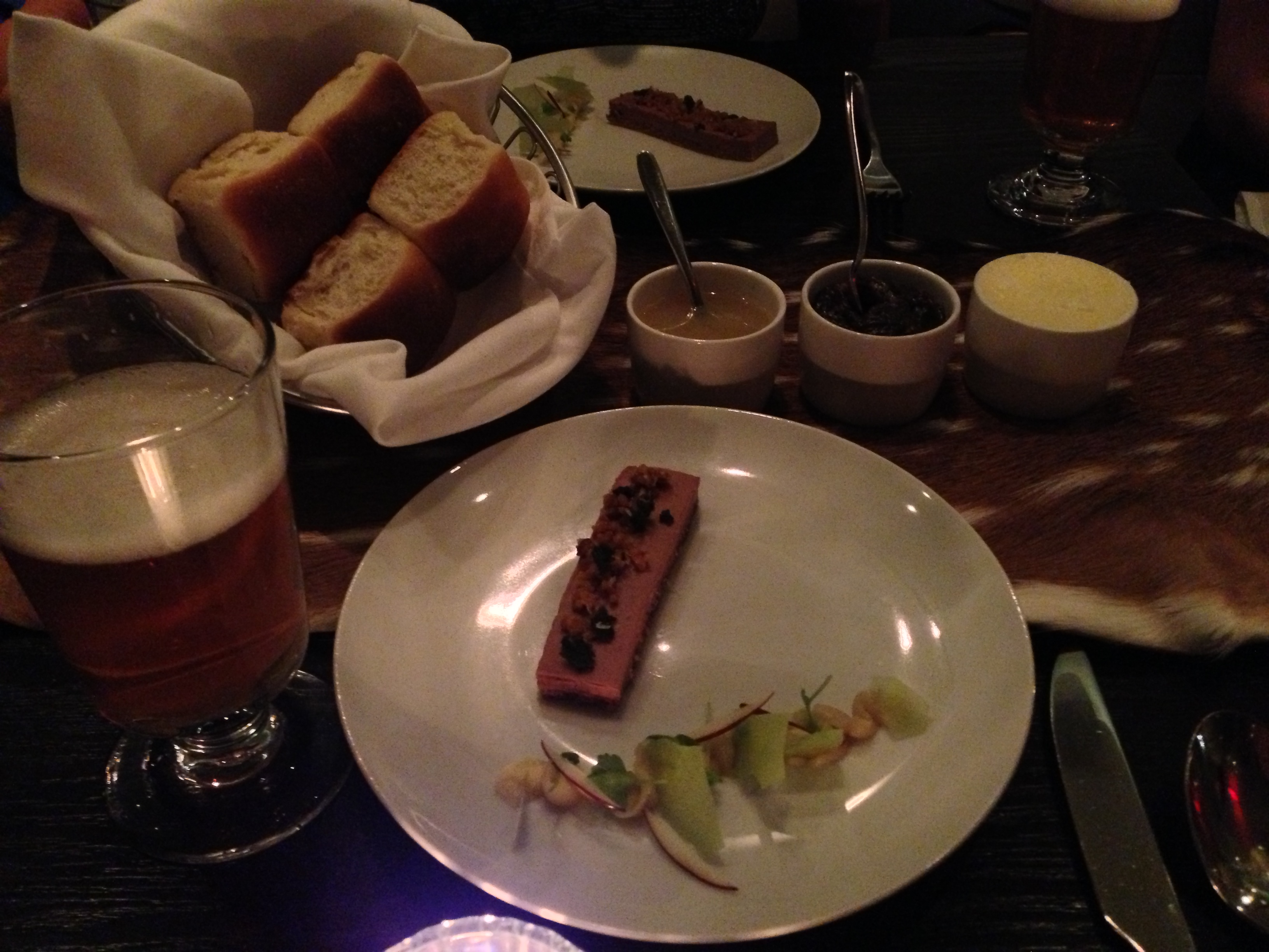 They paired this with an AMAZING beer: pumpkin ale with allspice (Jamaica pepper). It had a strong pumpkin flavor, and the spice added hints of cinnamon and other flavors. It encapsulated fall—and the menu—very well, and the combination with the other ingredients makes this possibly my favorite beer.
