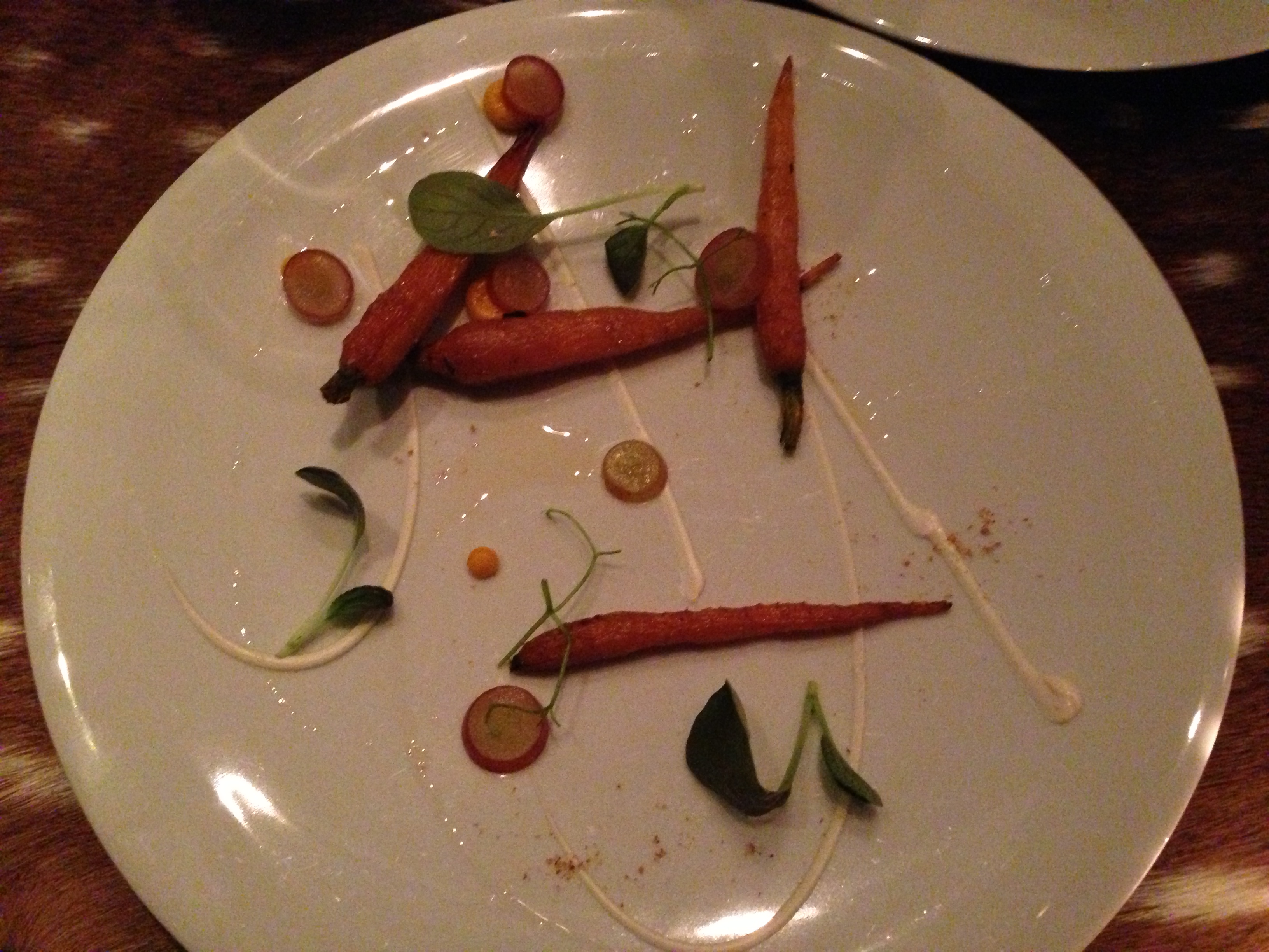 Roasted carrots, carrot purée, sliced grapes, and crème fraîche.