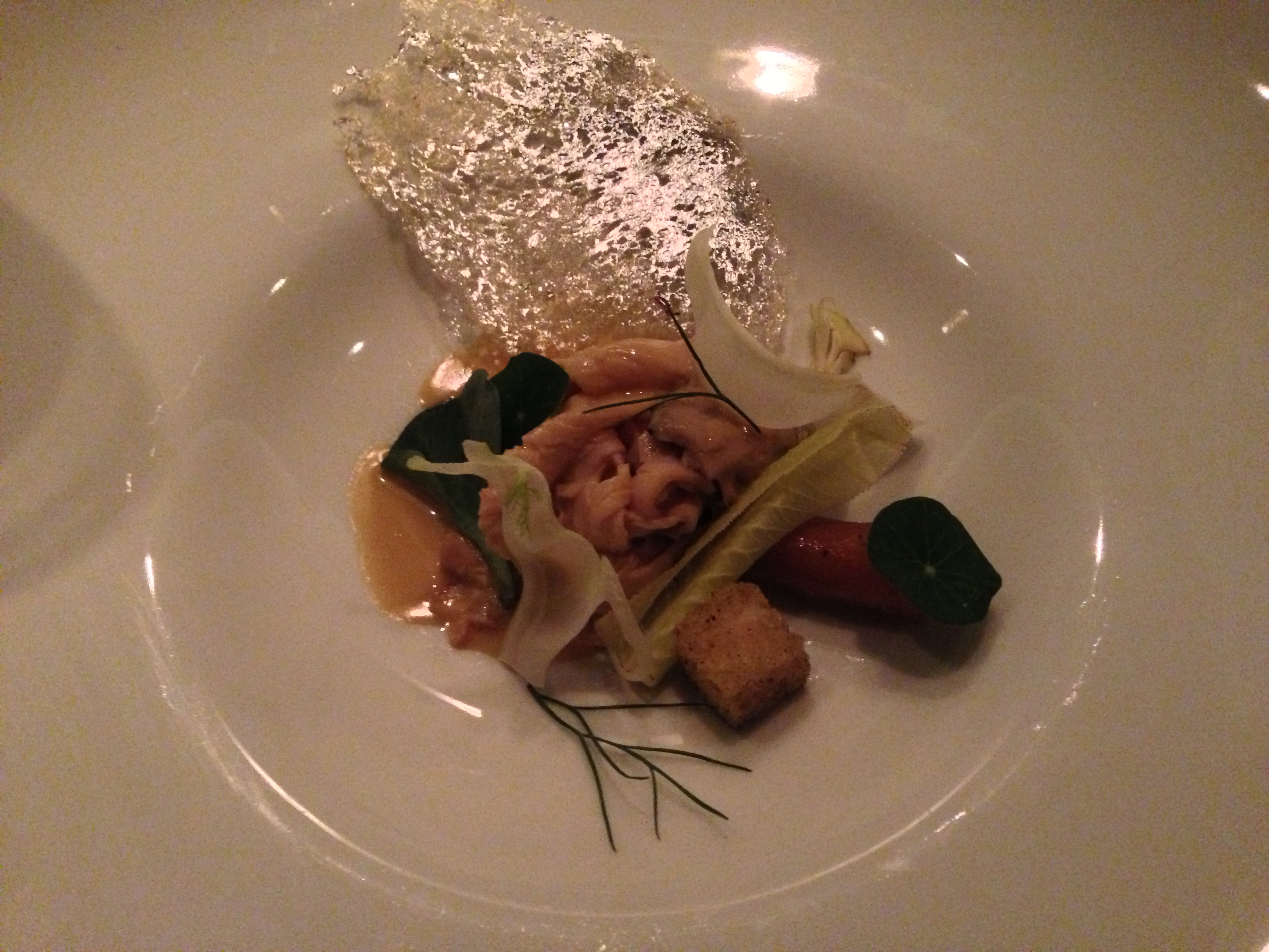 Turkey breast, oyster velouté (that actually has the taste of traditional stuffing you’d find in New England), poached oyster, crouton, and silver “powder”.