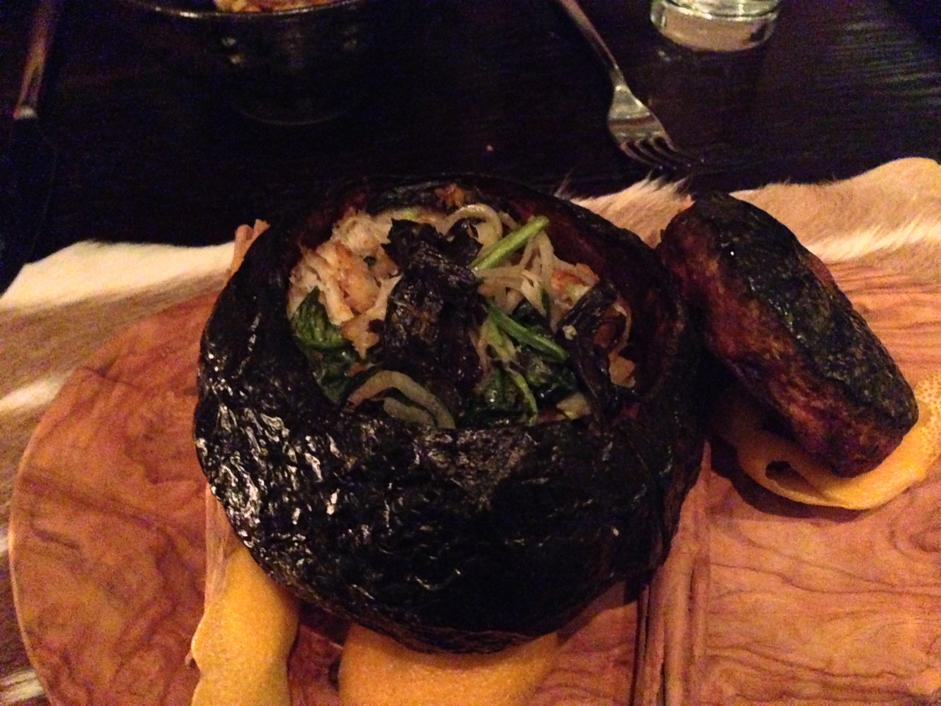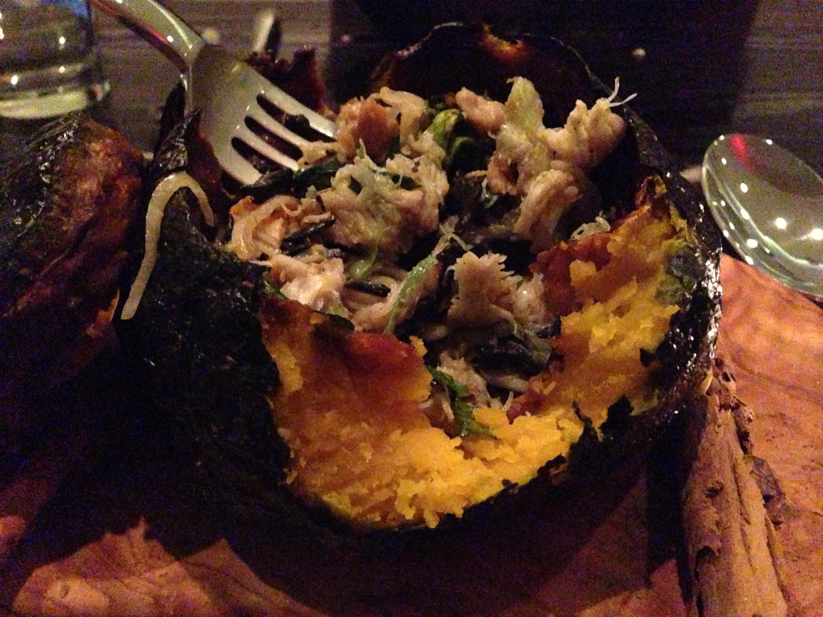 The Kabocha squash was burnt a bit, so its skin was very soft and edible. We ended up eating almost all of it, skin and all. It was pretty fun to be able to use my hands to pick off more bites of the squash… As for the condiments, the fried pumpkin seeds provided a nice, crisp contrast to the softness of the crab and squash, and the condiments overall also provided a more savory counter to the sweetness of the crab and squash.