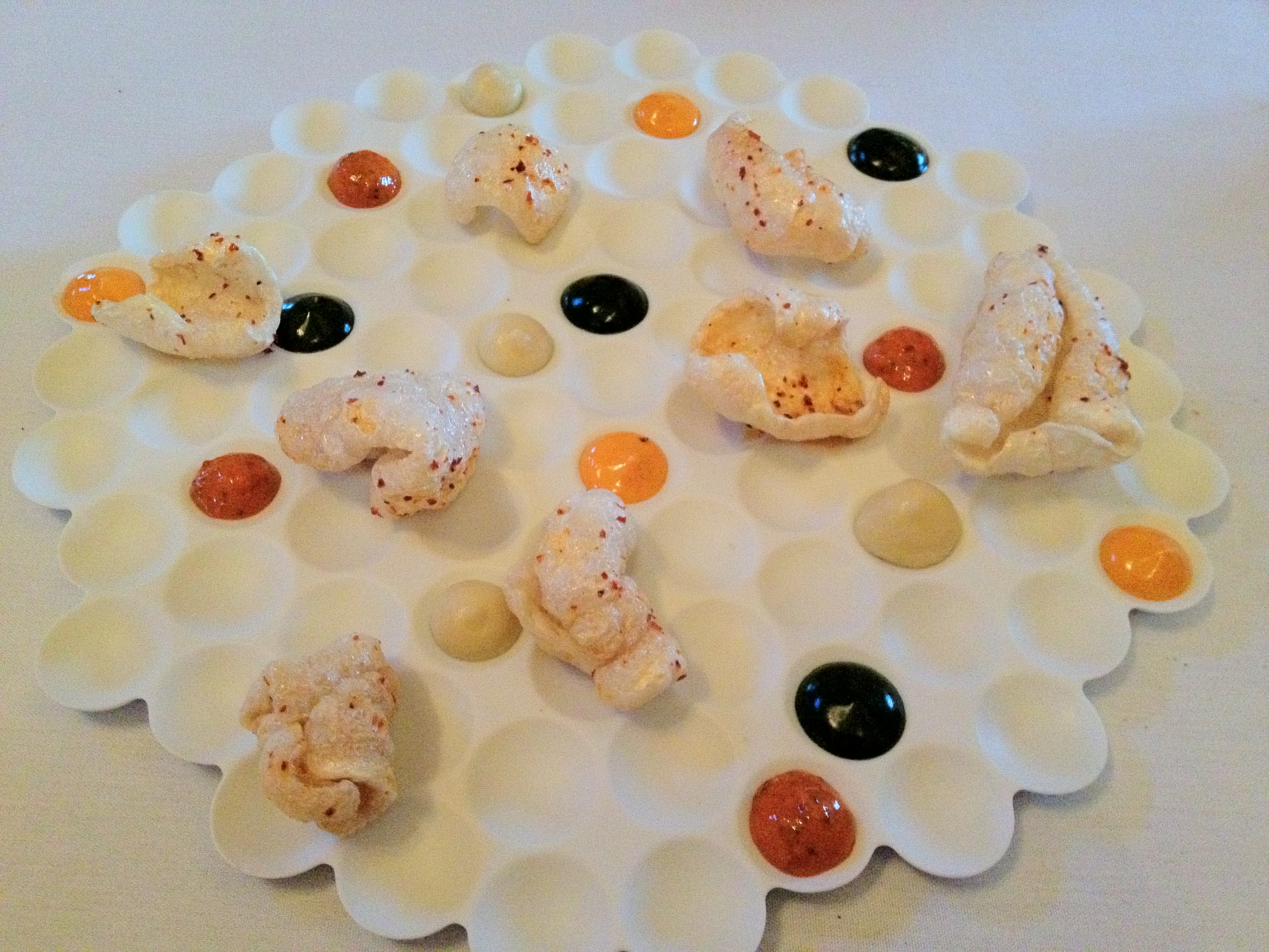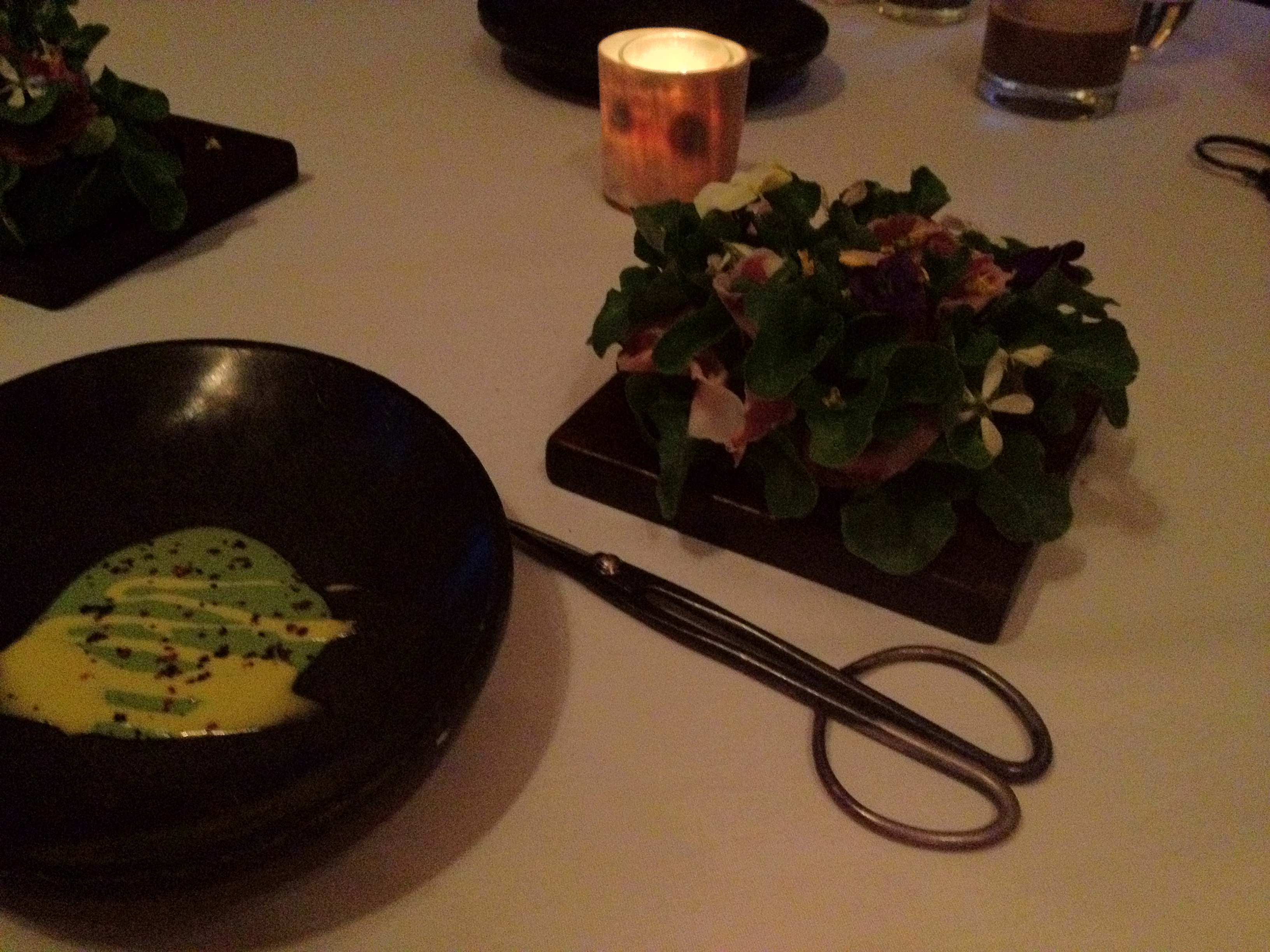 Simon: We used the chicharrón like chips. The horseradish was not what any of us expected, very not spicy. The highlight was definitely the phytoplankton (dark green). It pretty much tasted like liquified/saucified seaweed.