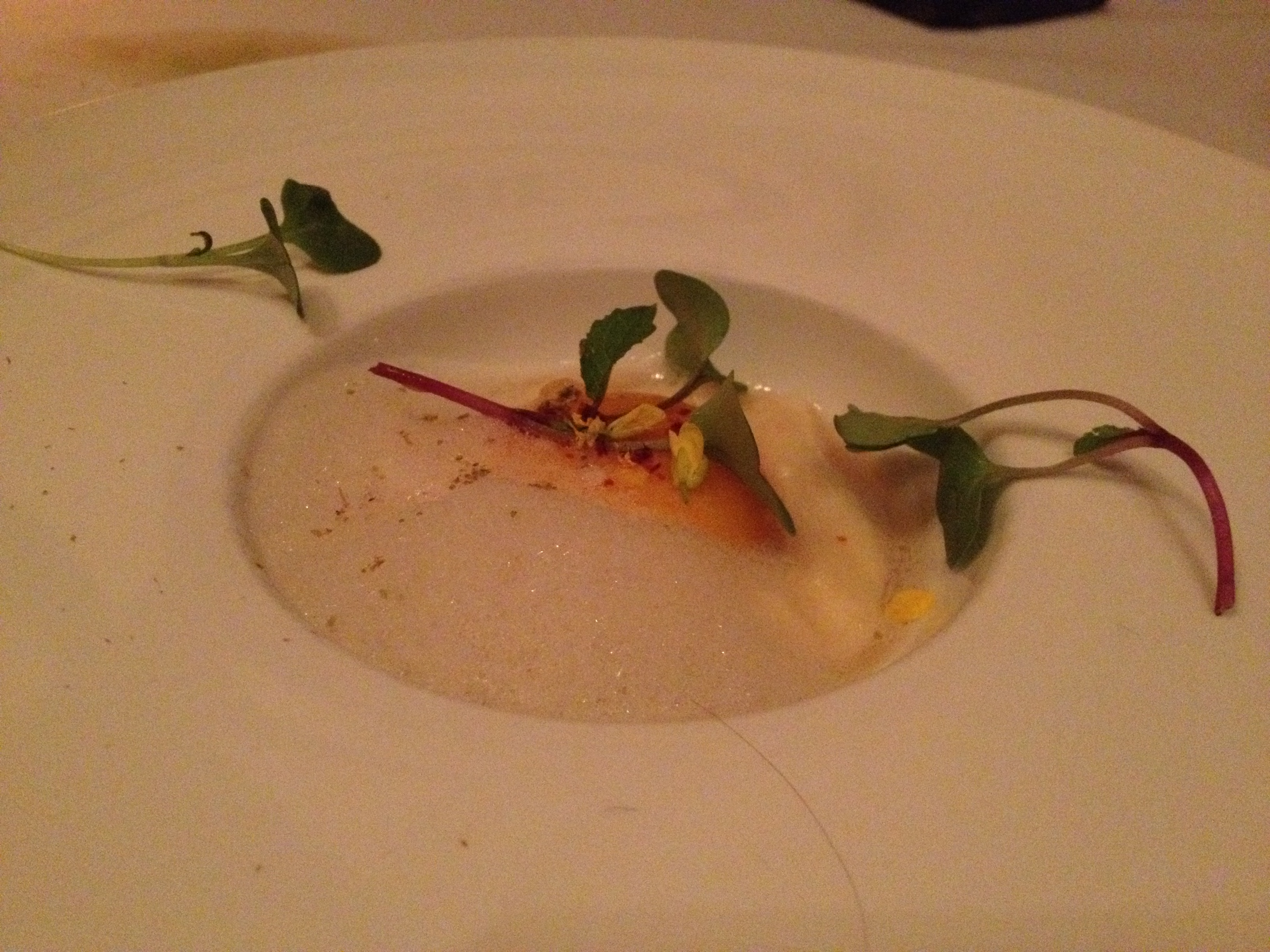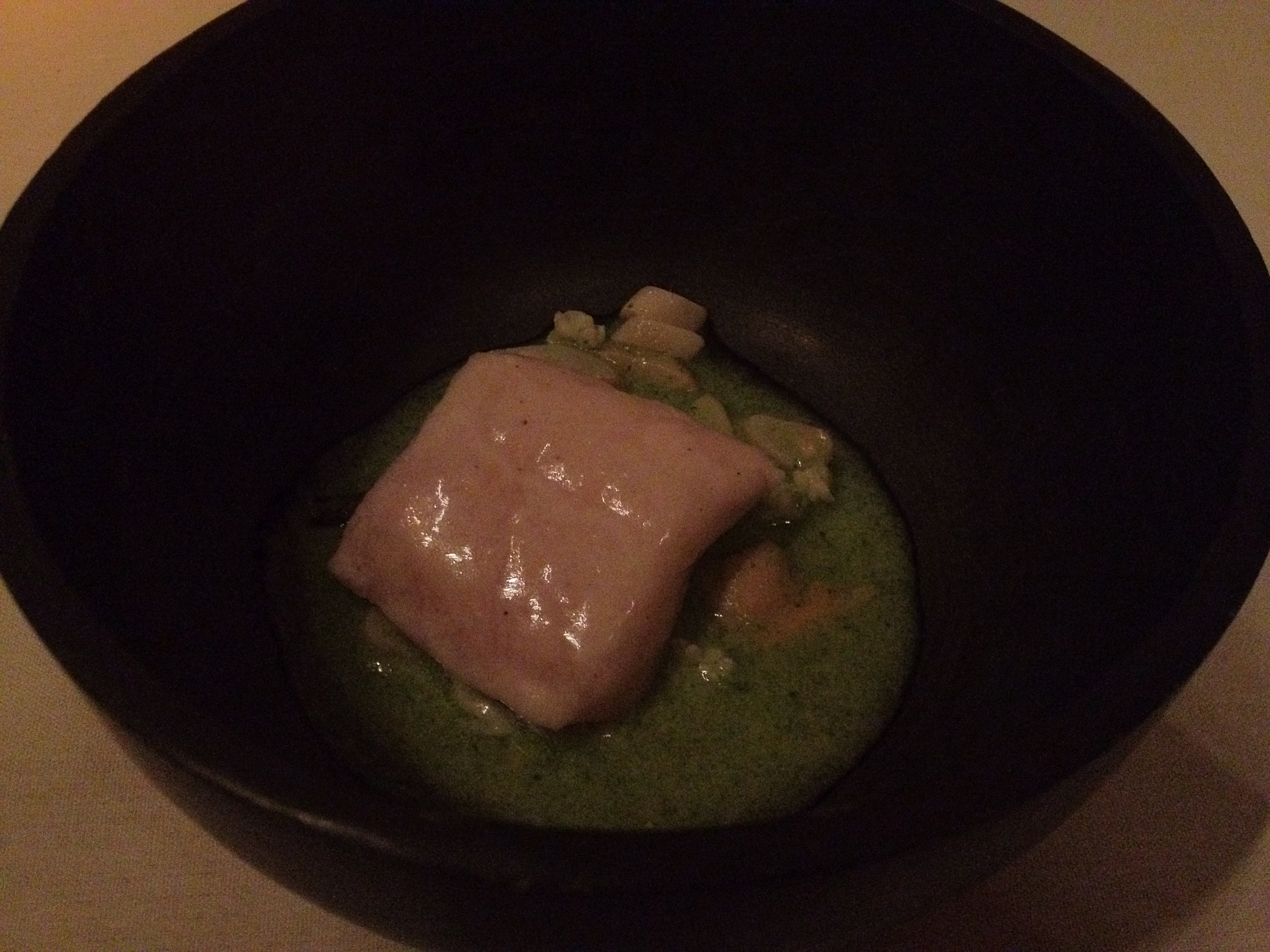 Simon: The fish was perfectly cooked, definitely sous vide. The green garlic sauce complimented the fish well, but the shellfish was distracting in this course.