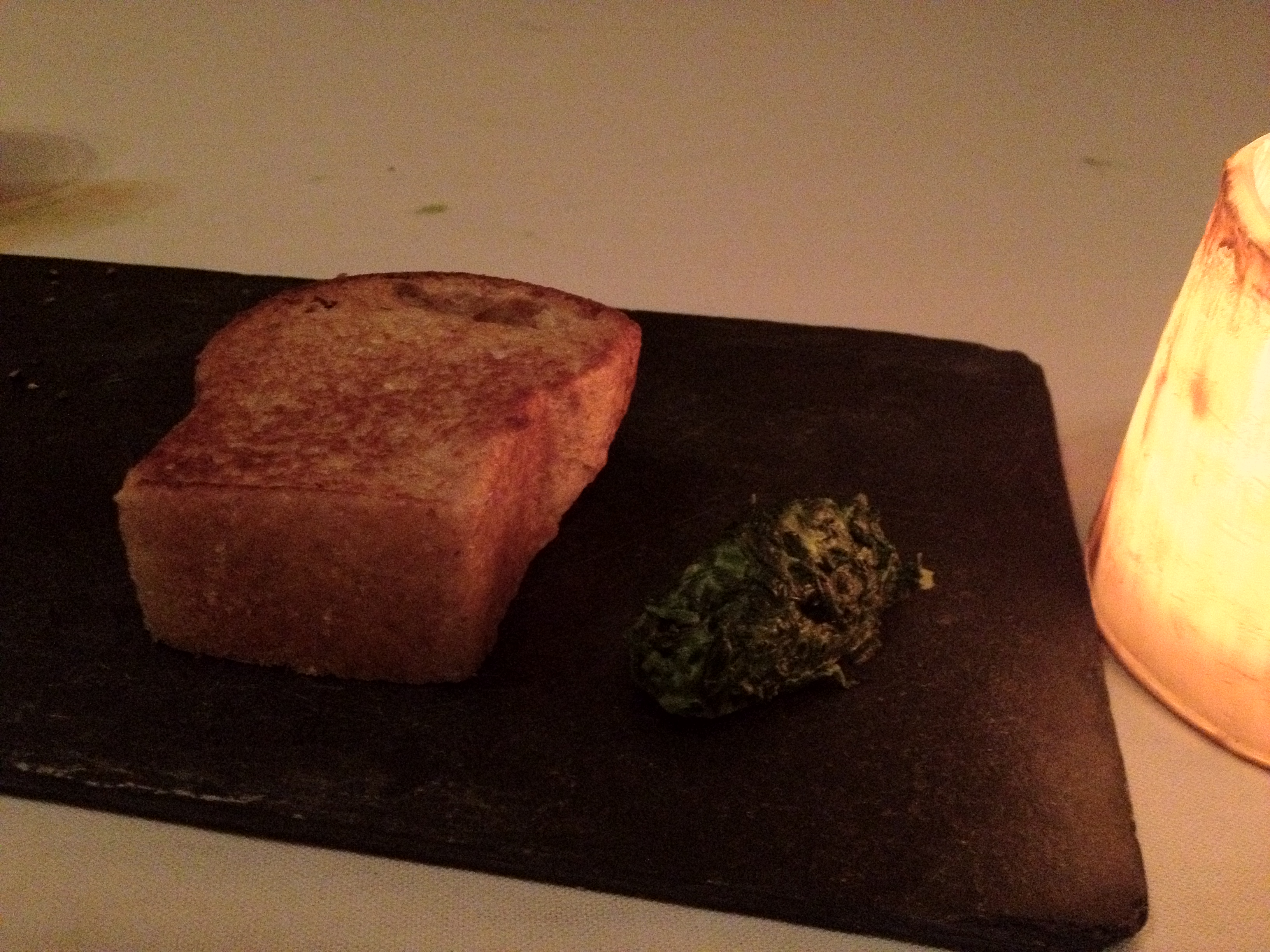 Brioche with kale, Swiss chard marmalade, and black pepper (for seasoning).