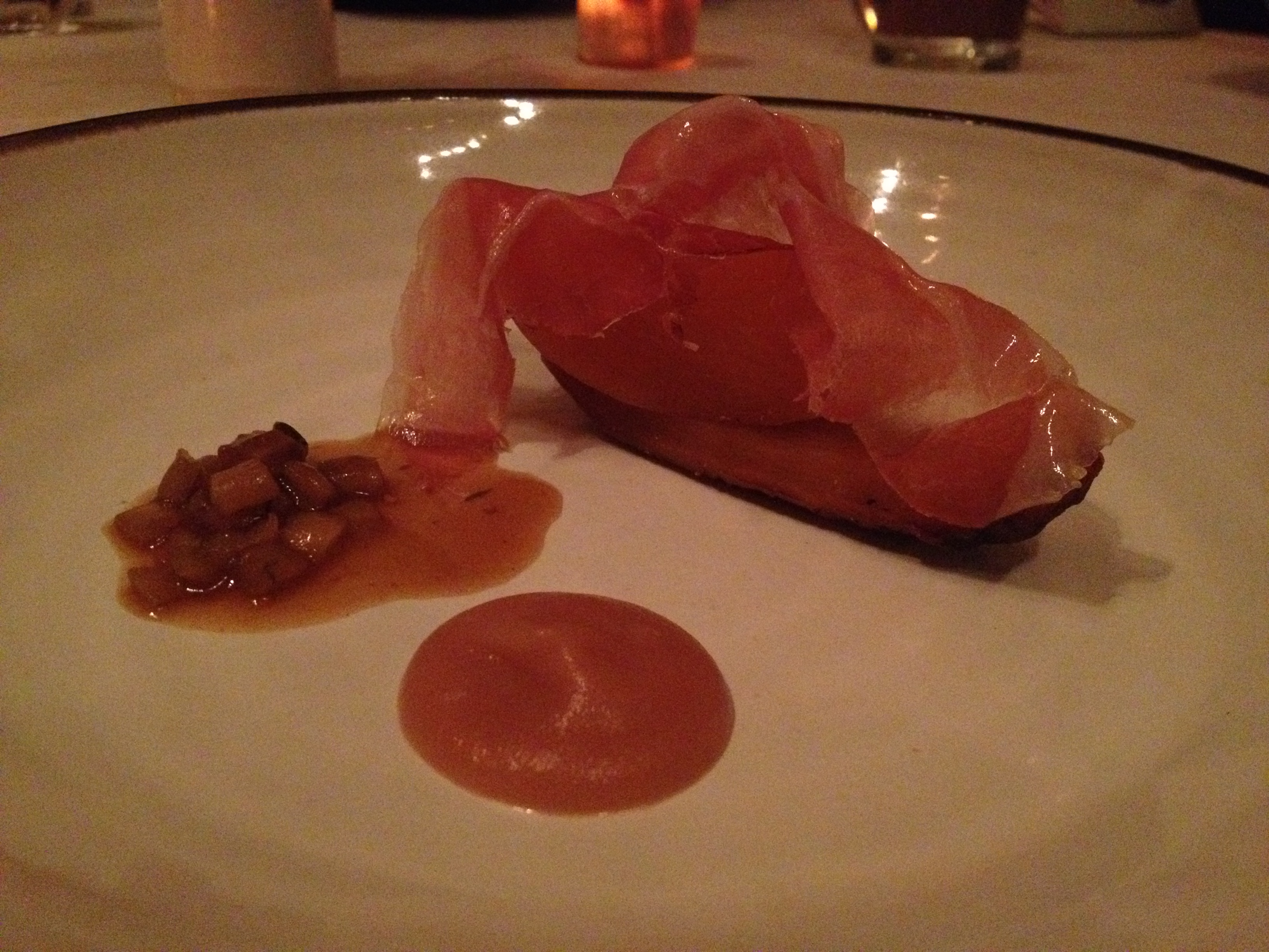 Salt-baked rutabaga, speck from Berkshire pigs, smoked apple sauce, and preserved eggplant.