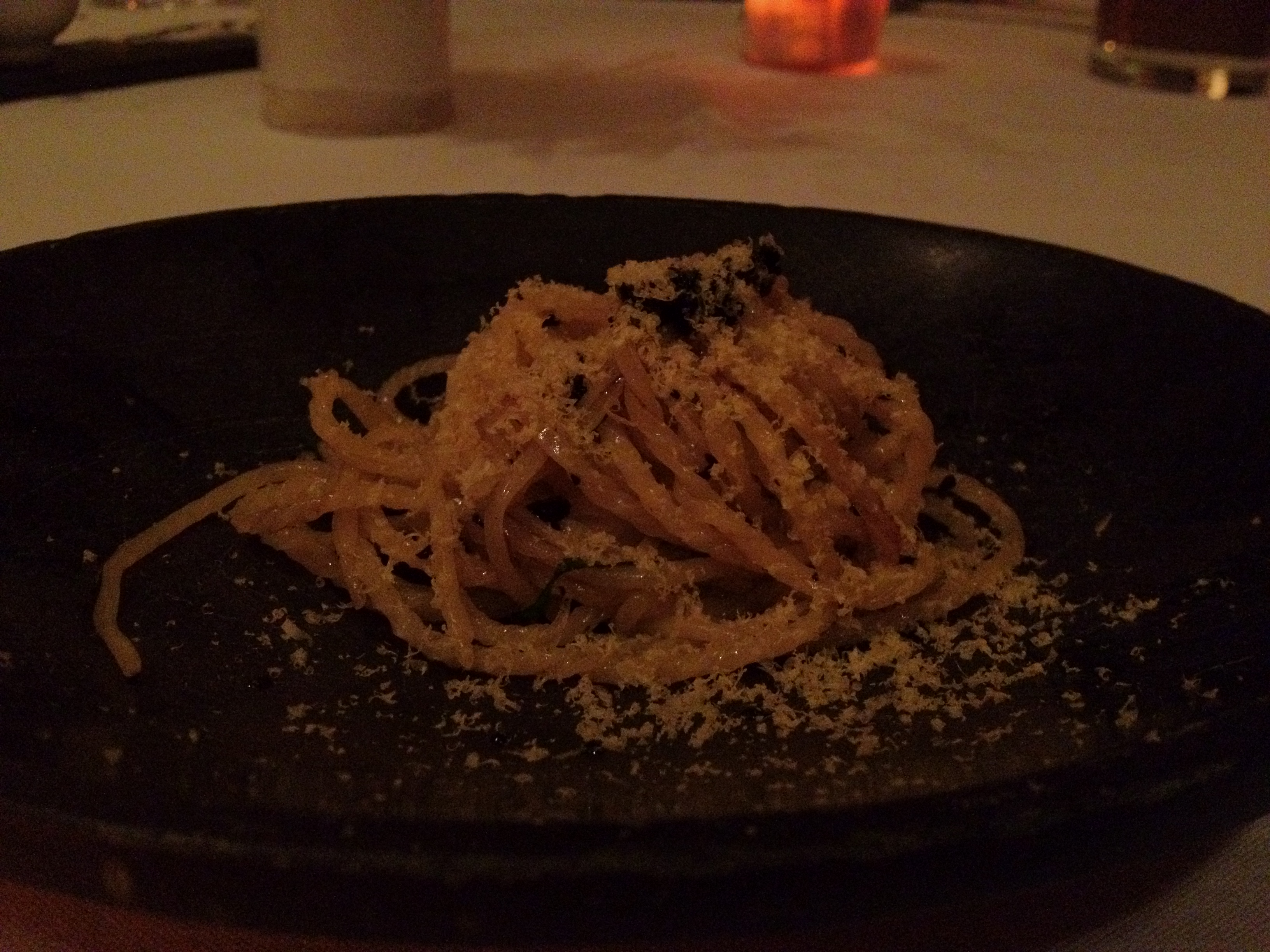 They chose goose eggs for the pasta because the eggs have the highest concentration of protein in the yolk, translating into greater flavor. The immature egg is extracted from the hen and cured so that the flavor can concentrate. It is then shaven over the pasta like truffles or cheese.