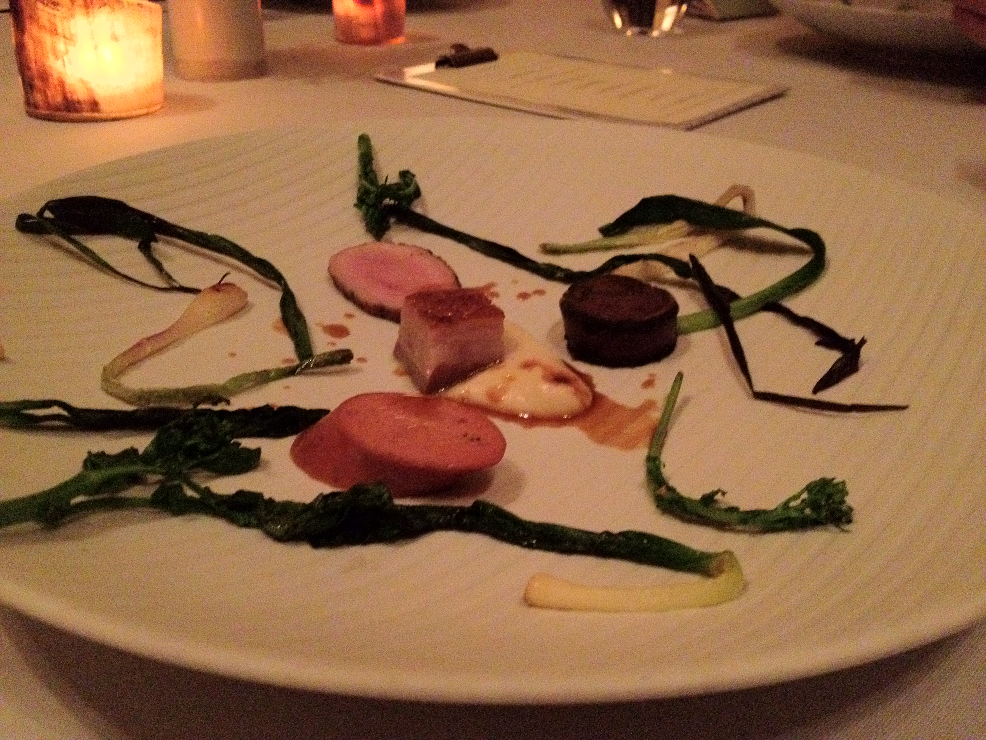 Stone Barns Berkshire pork (frankfurter, belly, blood sausage, and loin), broccoli rabe, spring Allium vegetables, and parsnip puree.