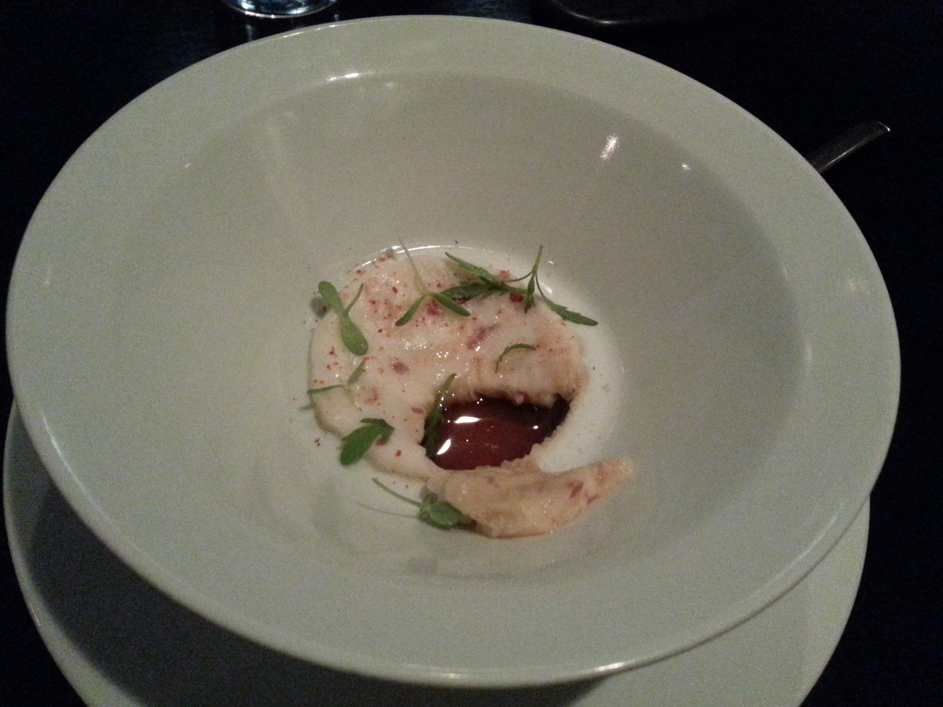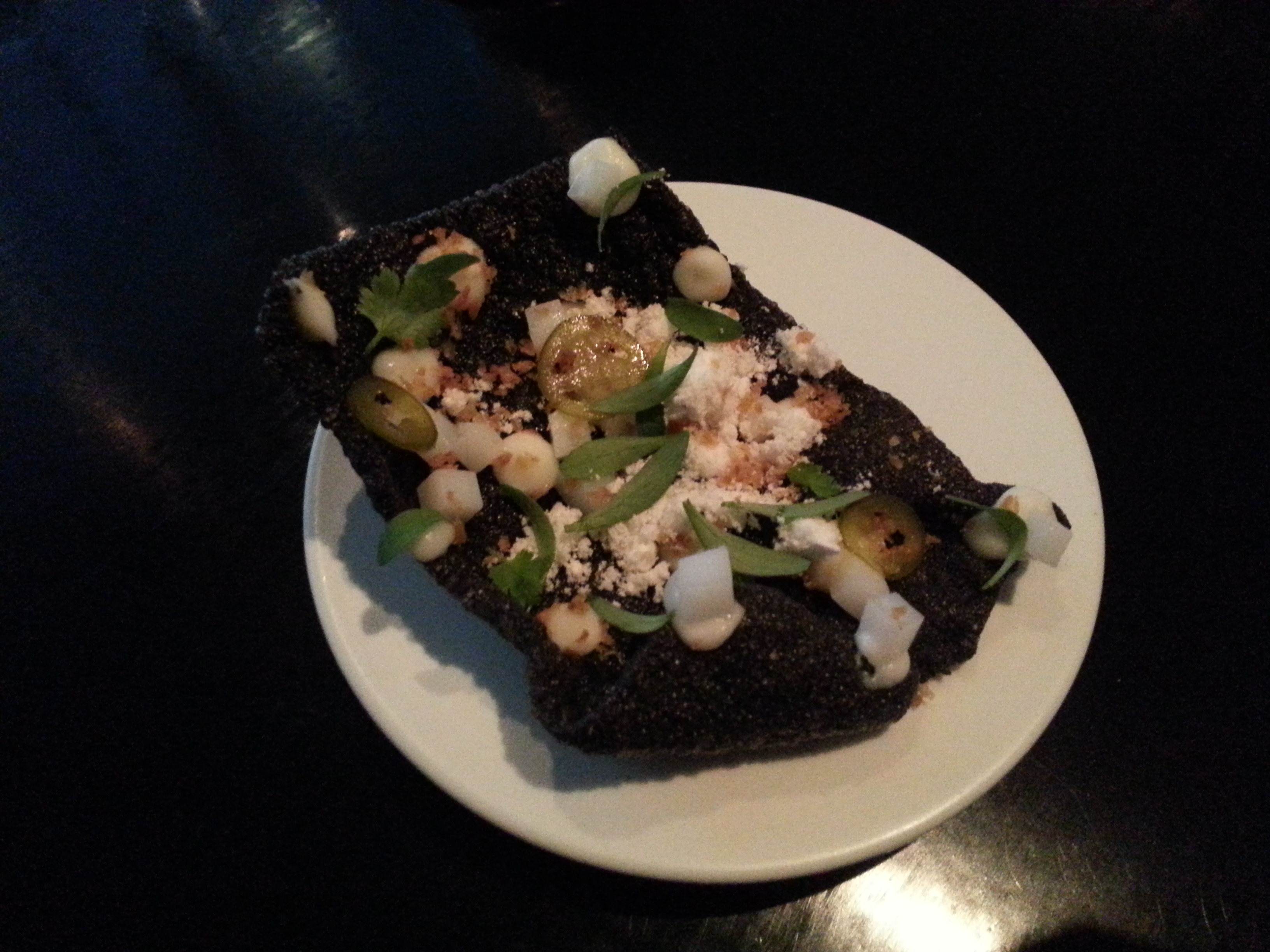 To me, this was the most brilliant of all the dishes. There was a cracker made with squid ink, (and I think had squid infused into it?) bits of squid on top, and jalapeno and herbs. I thought it was going to be stir fried dish from the sound of it, but this dish was just so innovative. The cracker was full of seafood flavor, and the bits of squid on top were extremely tender – not chewy like bad squid can be. The bright herbs and spicy peppers brought together this fishy dish and brightened it up a lot. Every bight was just very exciting.