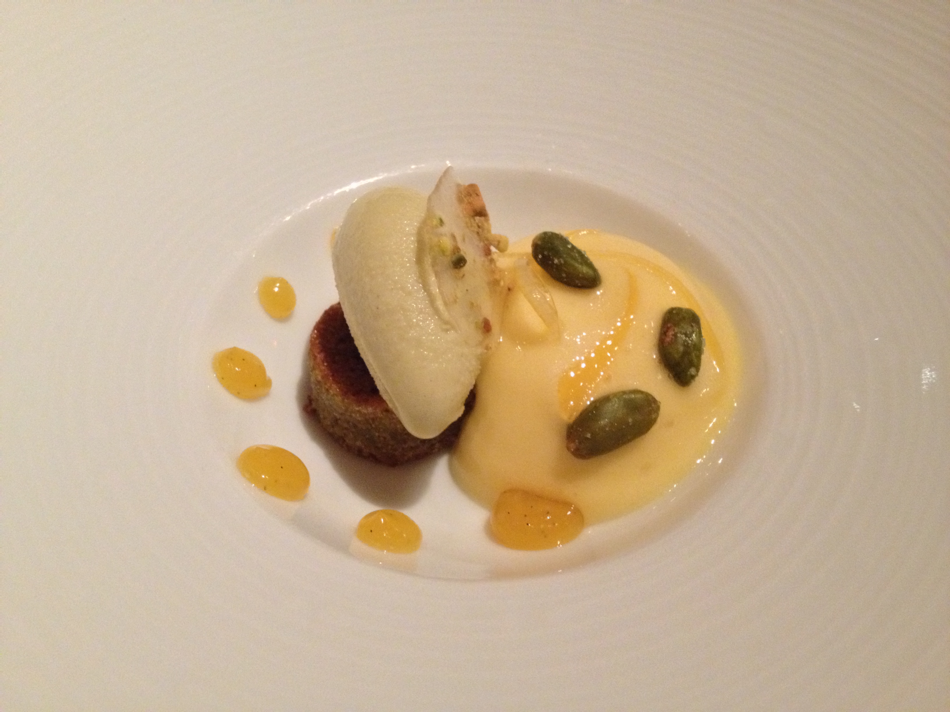 Pistachio ice cream, pistachio financier, passion fruit mousse/foam (it’s like a cross between the two), and meyer lemon sorbet.