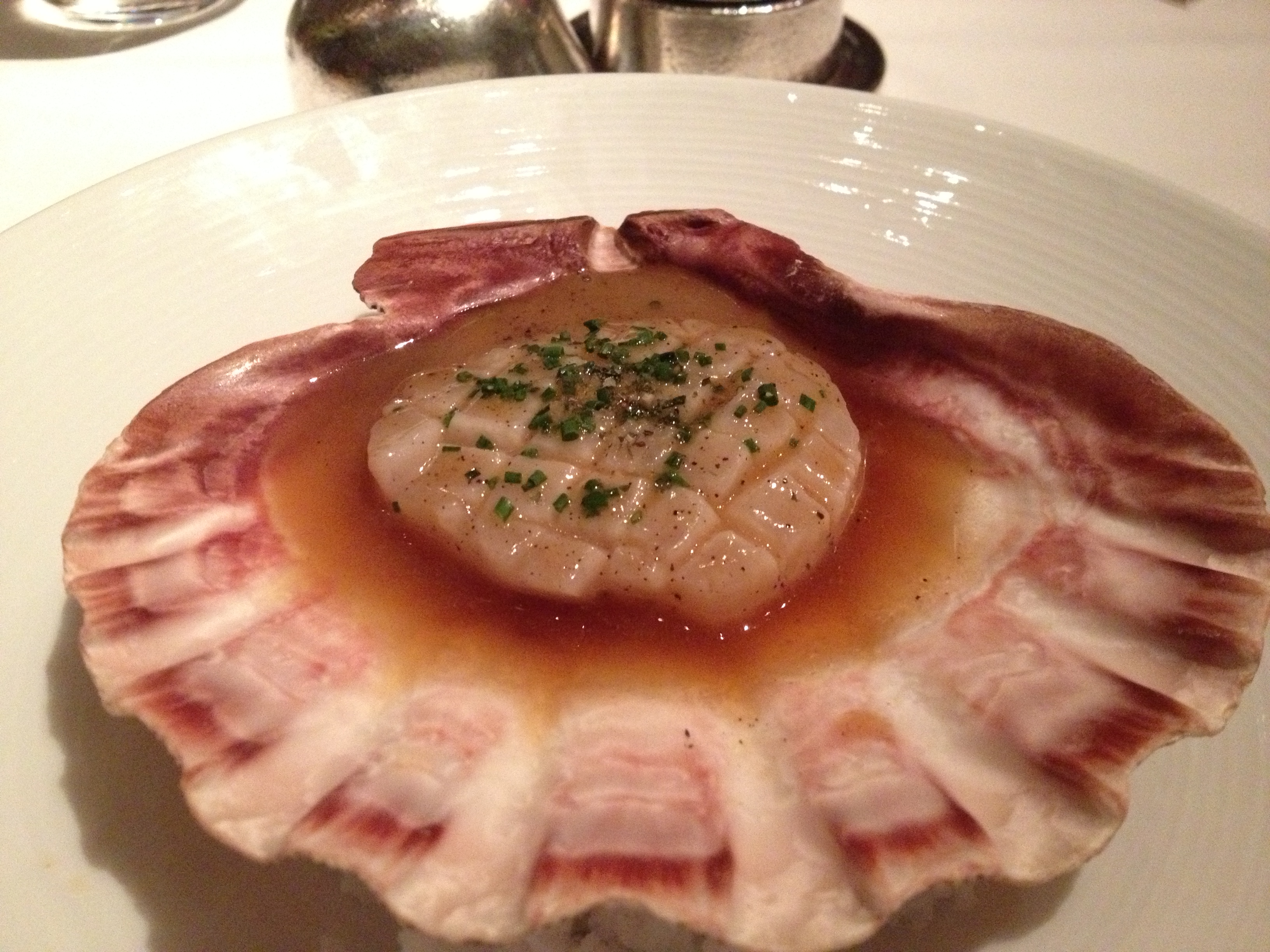 “Barely-cooked scallop” that was brushed with brown butter sauce, topped with chives, and served with dashi broth.