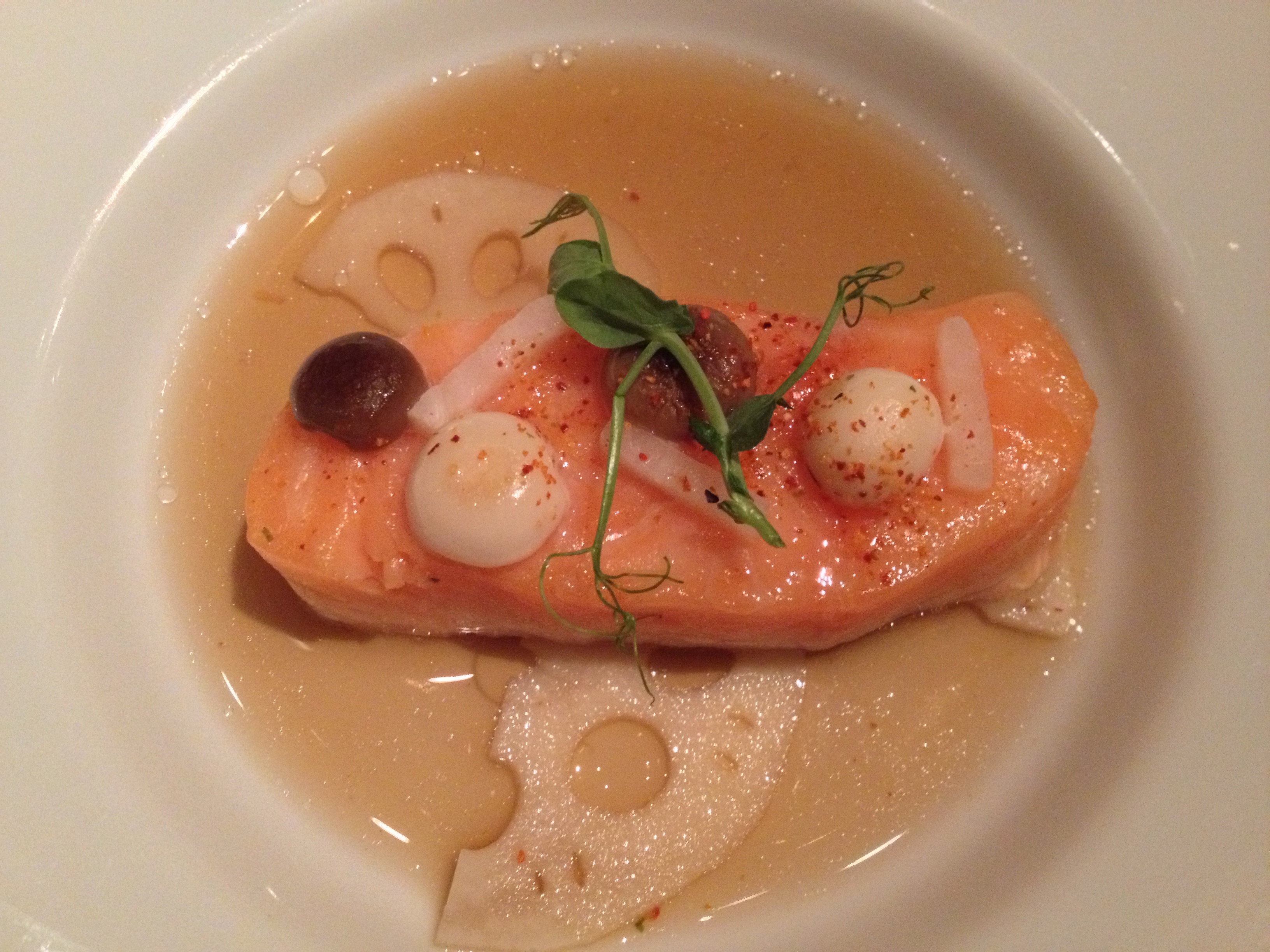 Wild salmon (lightly cooked from the bottom—it’s rare from the bottom to the middle) with sweet and sour hon shimeji mushrooms, pea tenders, slices of lotus root, and maitake mushrooms.