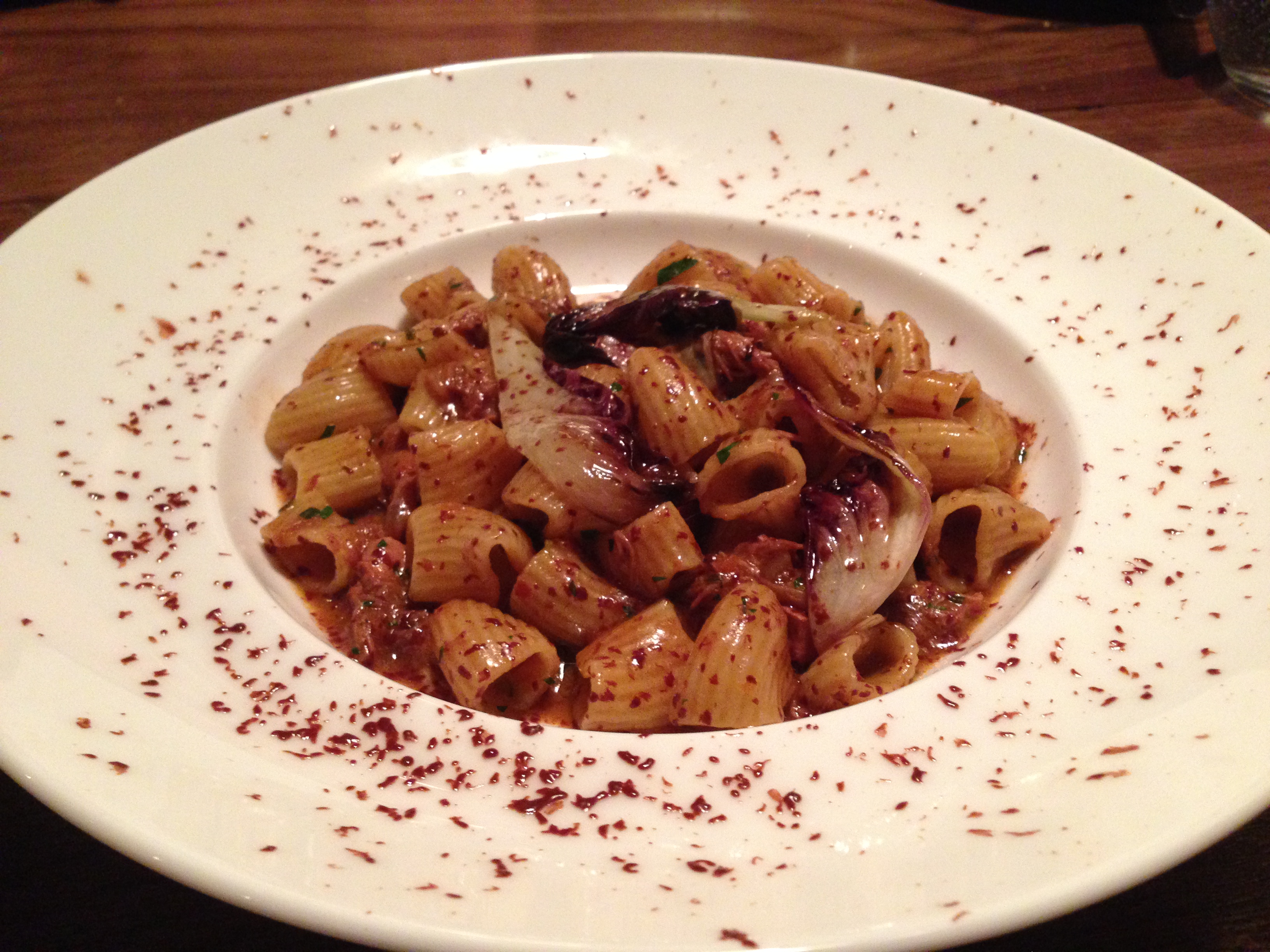 Primo 3: Lumache with aged duck ragu, Treviso, and chocolate.